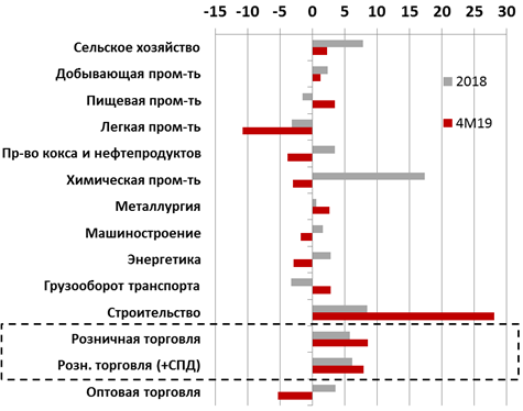 Стоит отметить, что в начале года было несколько факторов временного действия, тянувших общие валовые показатели вниз. Так, наблюдались провалы в производстве акцизных товаров – это стало традиционным ответом производителей на повышение акцизных ставок. Они наращивают производство накануне, чтобы успеть обложить больше товара по “старой” ставке налога. Потом производство сокращается. Особенно заметно это по производству сигарет – оно обвалилось вдвое в январе, но уже в марте перешло в рост почти на 30% в годовом выражении.