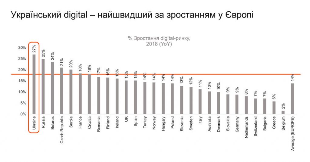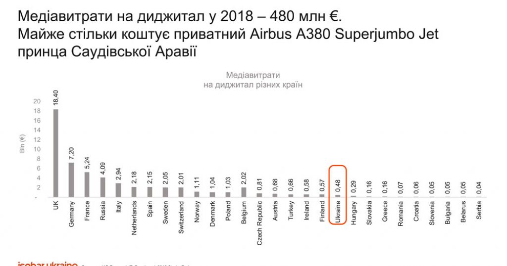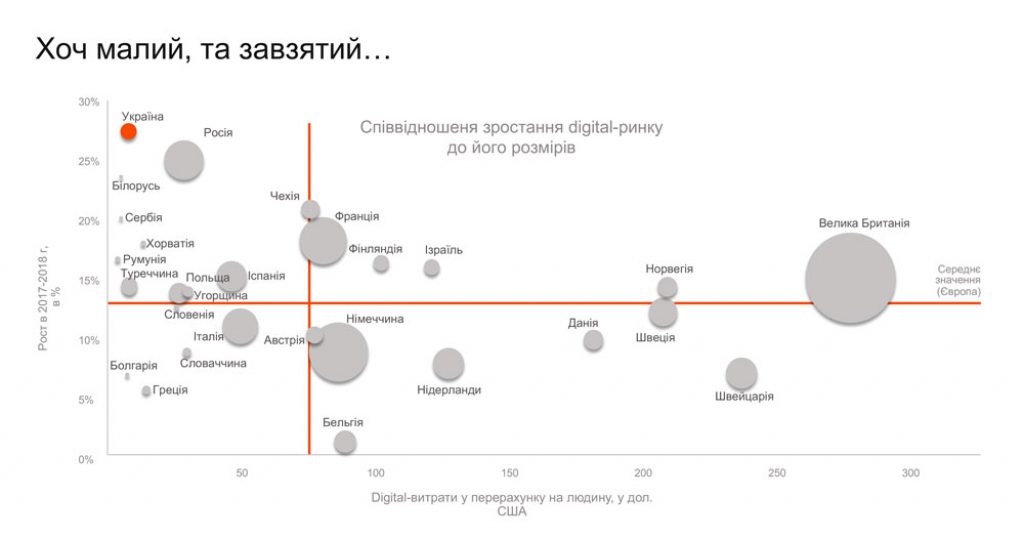 В 2018 году затраты на диджитал в Украине составили 480 млн евро. Несмотря на то, что по объему рынка наша страна сильно уступает соседним России, Польше и Турции, по динамике роста мы — на первом месте.