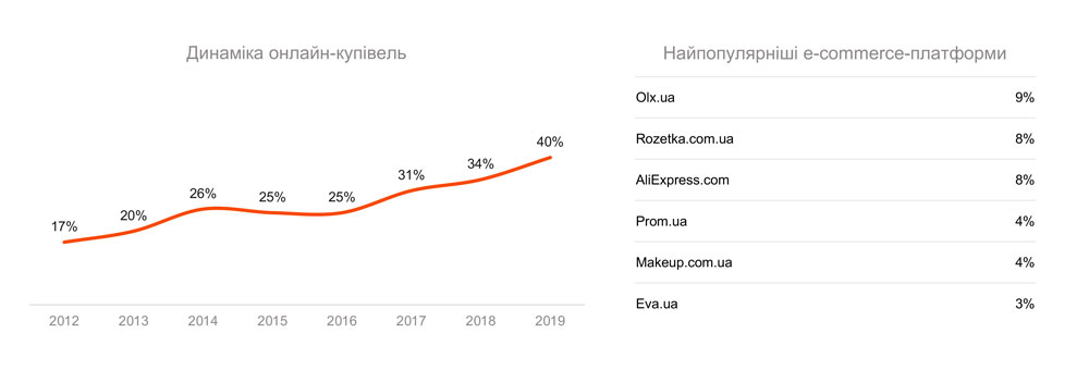 40% населения Украины на сегодня делает покупки онлайн. В 2012 году этот показатель составлял всего 17%.
