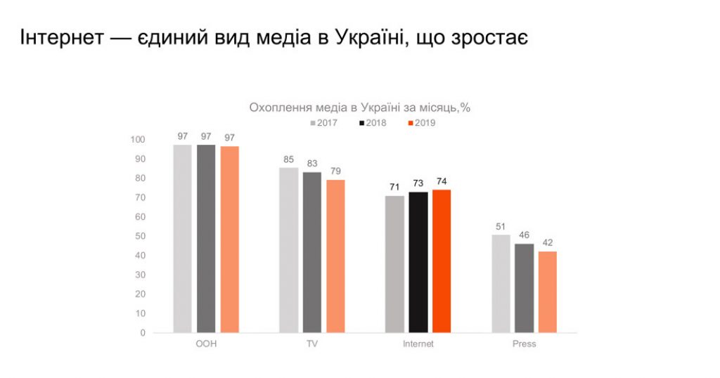 Интернет — единственный тип медиа, который растет в Украине. На сегодня на него приходится более трети всех рекламных бюджетов. Самый популярный тип размещений — контекстная реклама.