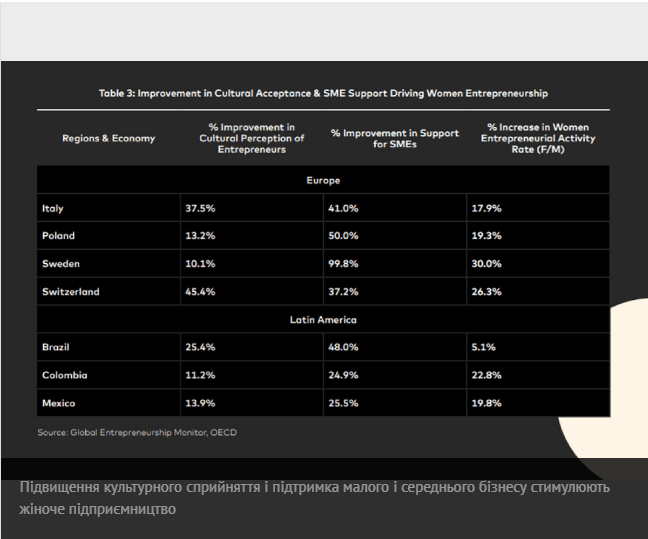 - Третє місце дісталося Швейцарії, яка просунулася вперед на вісім позицій. Цьому сприяло посилення держпідтримки малого та середнього бізнесу і значне зростання культурного сприйняття підприємництва.