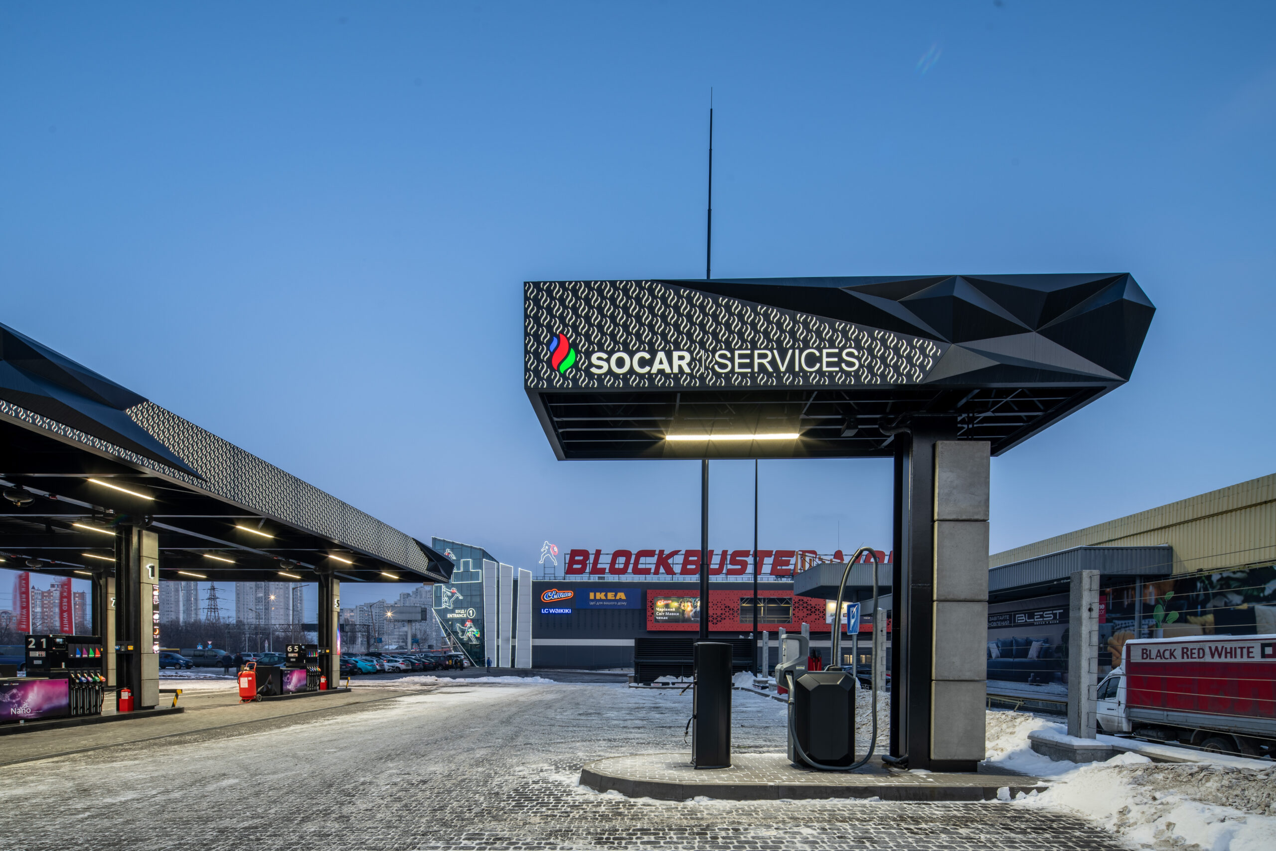 Новий АЗК традиційно оформлений в сучасному індустріальному стилі, монохромному, з переважанням чорного кольору. Трендовою «родзинкою» SOCAR залишаються незвичні рішення з використанням полігональних поверхонь в інтер’єрі та екстер’єрі, дизайнерські меблі, а також стильні світлодіодні екрани на ціновій стелі, на колонах і фризі навісу. Крім актуальної інформації про погоду, ціни на пальне і курси валют, яскраві екрани дозволяють повідомляти гостям SOCAR про акції та вигідні пропозиції від партнерів мережі.