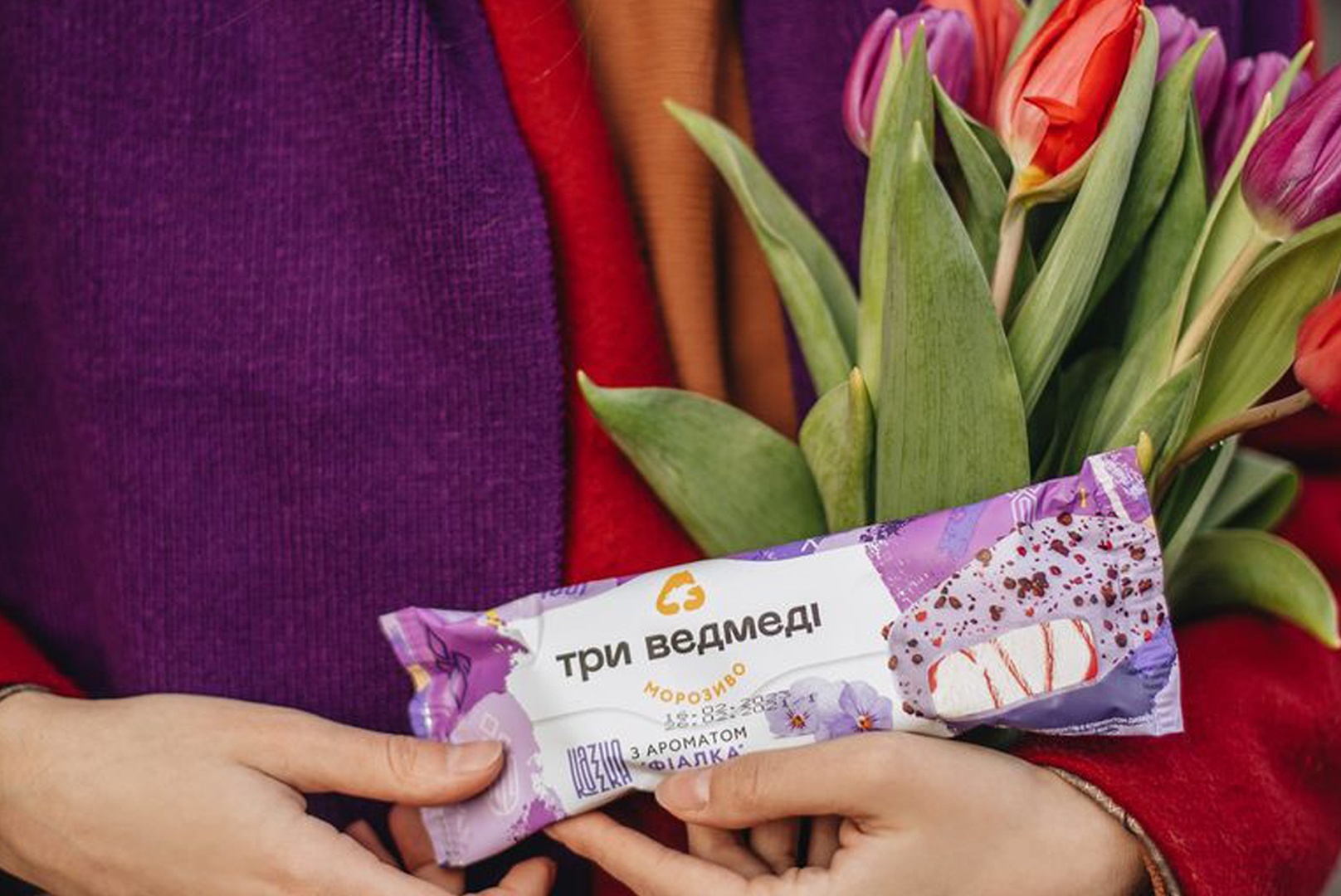 Для зіркової колаборації «Три Ведмеді» розробили ексклюзивне морозиво КАZКА з ароматом фіалки – це унікальне смакове рішення, на яке надихнув згаданий хіт. Новинка являє собою мусову ванільну основу з чорничним наповнювачем та глазур’ю ніжно-фіолетового кольору з легким ароматом фіалки, декоровану сублімованою ожиною.