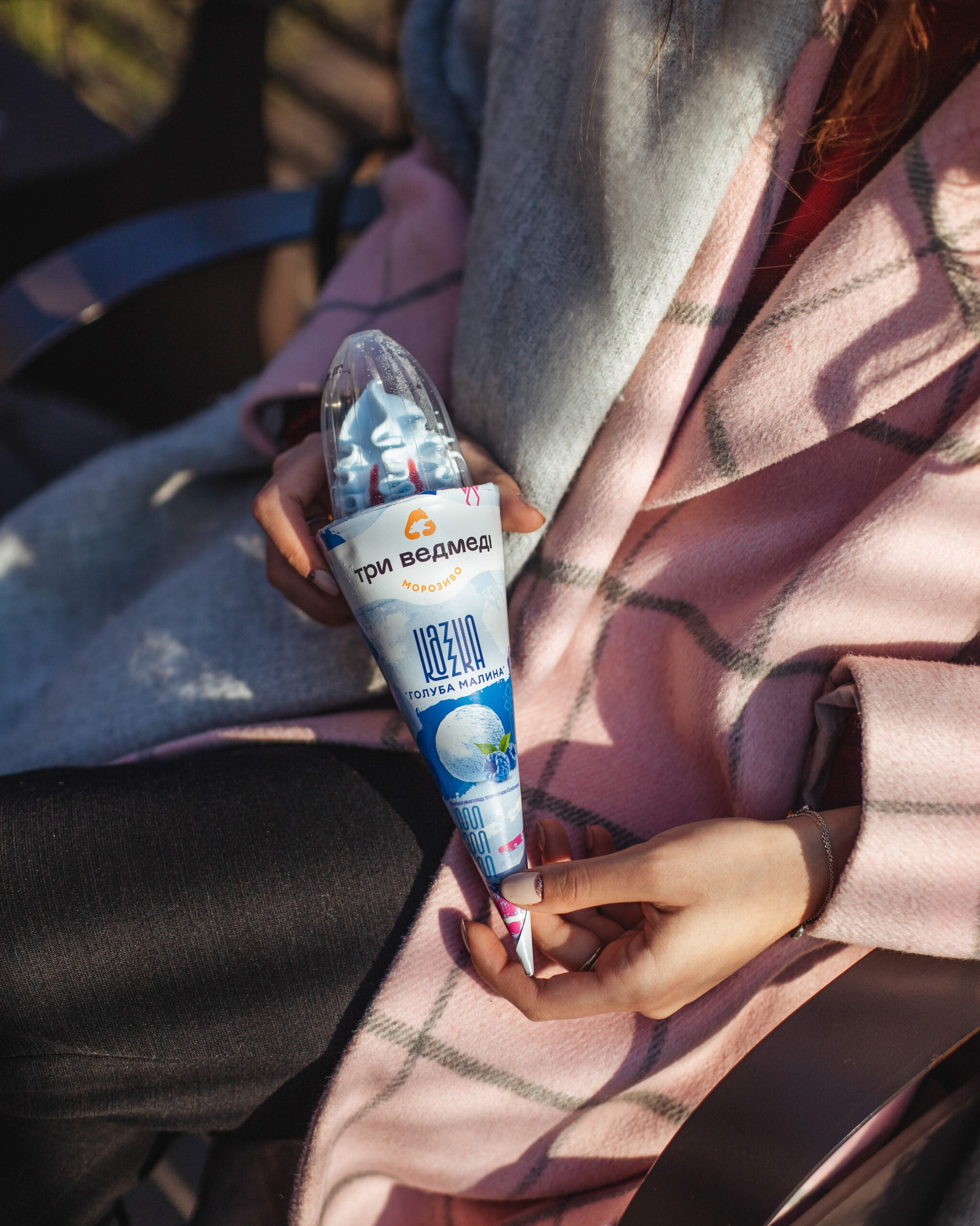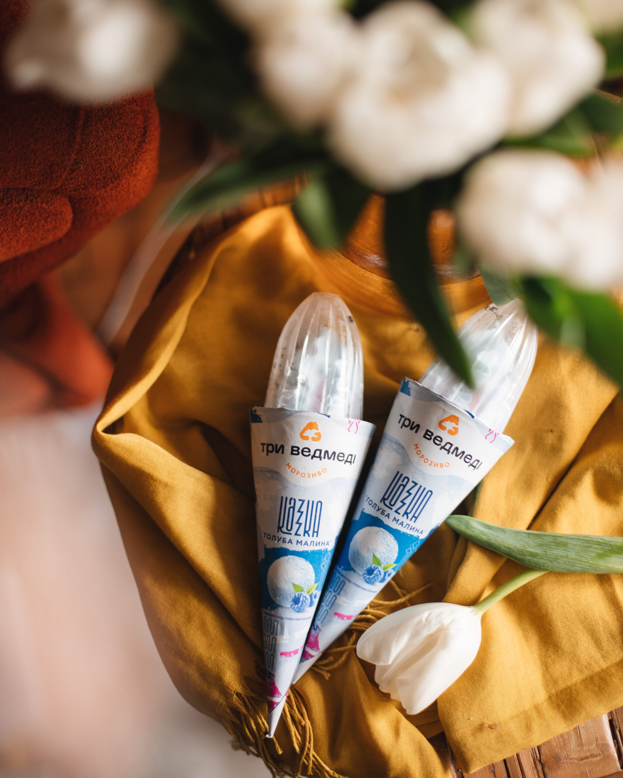 Компанія «Три Ведмеді» та гурт KAZKA презентують вже другу новинку в рамках колаборації – морозиво «Голуба малина». Воно буде представлене у вафельному цукровому ріжку, всередині вкритому глазур’ю.