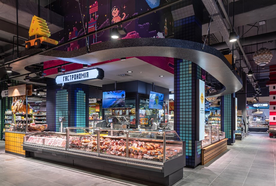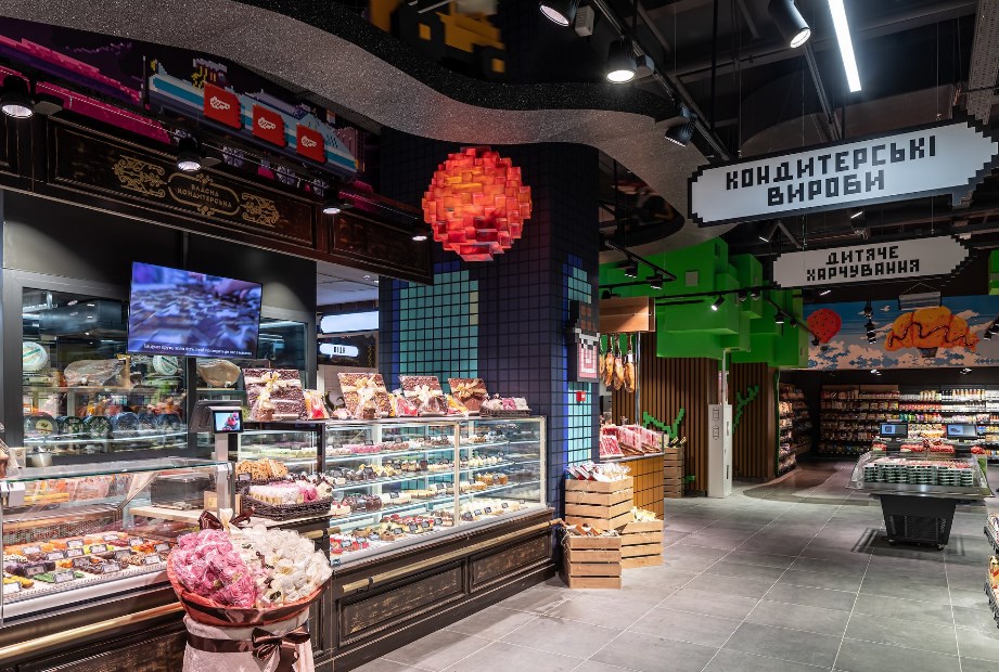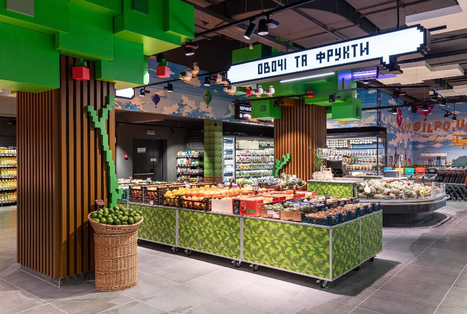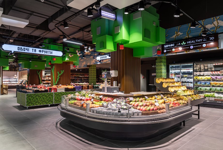 1170 м2 торгового залу ? це гра-бродилка від гаю до моря через гори і скелі. Тут над джерелом екзотичних, незвичних, але справжніх фруктів й овочів крізь піксельні дерева виглядають піксельни голуби.
