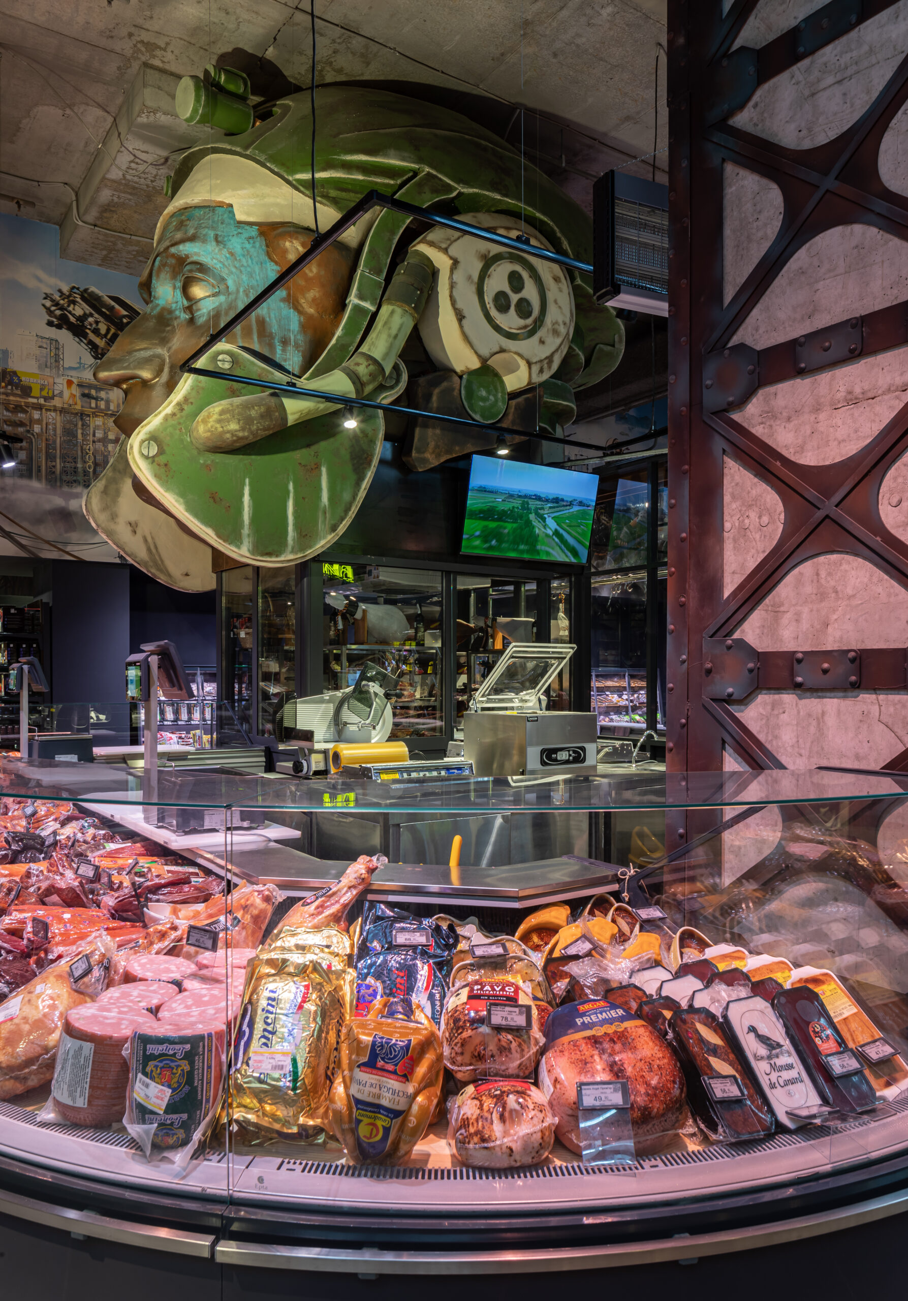 У магазині відтворено альтернативну реальність. Це суміш ретроспективи у напіввигаданий світ і презентація найсвіжішого та найкращого, що є просто зараз у нашій сучасності. Дизайн ТРЦ «Нікольський» враховує особливості міста, тож ми вирішили продовжити цю тему та заклали в дизайн-концепцію місцевий контекст і колорит. Тут можна знайти артоб’єкти, що розповідають про визначних харків’ян: Лева Кононова, засновника картинг-школи, та Володимира Нікітіна, гоночна машина якого увійшла в історію автомобільного будівництва. Є також згадки про легендарного Олексія Бекетова та харківських науковців, які причетні до створення великого адронного колайдера, а ще посвята харківському метро. До оформлення «Сільпо» у стилі дизельпанк долучилися відомі харківські митці: тут є графіті Гамлета Зінковського й маска Боба Бассета, чиї роботи підкорили весь світ.