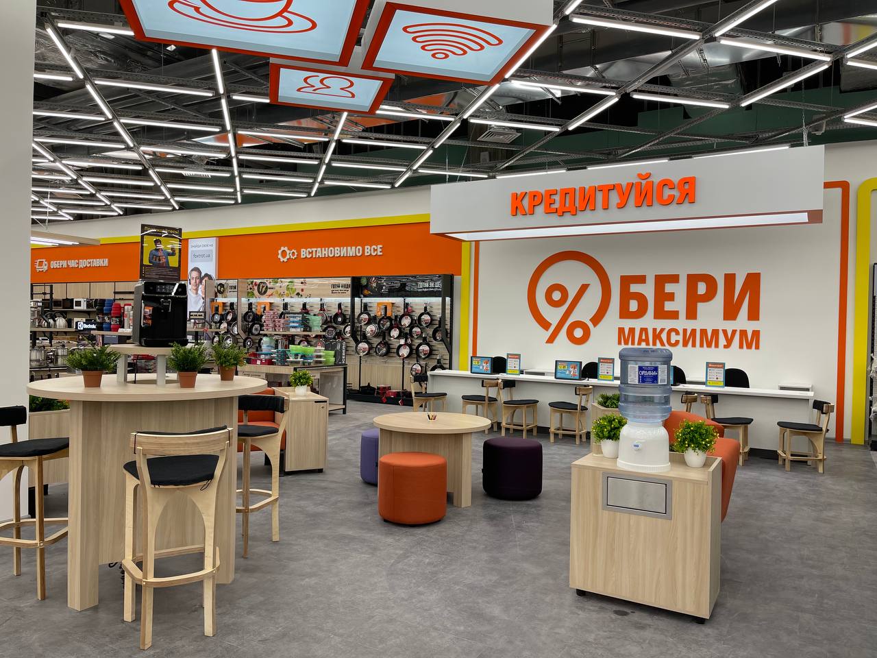 Розширена вхідна зона протяжністю 18 метрів дозволяє роздивитися магазин, як на долоні. По центру залу в оточенні торгівельних рядів розташувався сервісний хаб, де можна оплатити покупку, отримати інтернет-замовлення і скористатися послугами з налаштування техніки. По сусідству з хабом облаштований кредитний відділ для купівлі техніки в кредит від банків-партнерів, а також простора лаунж-зона.