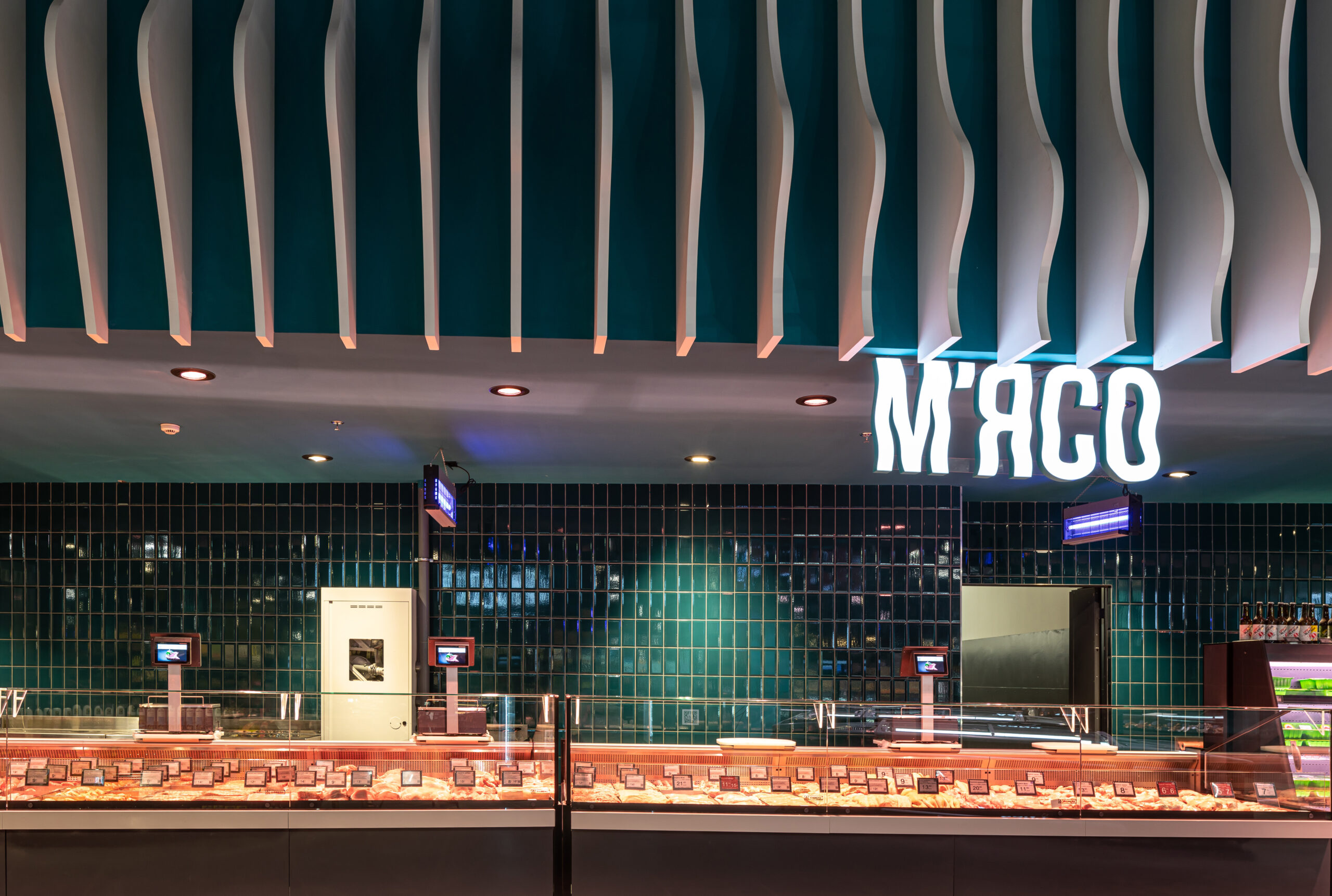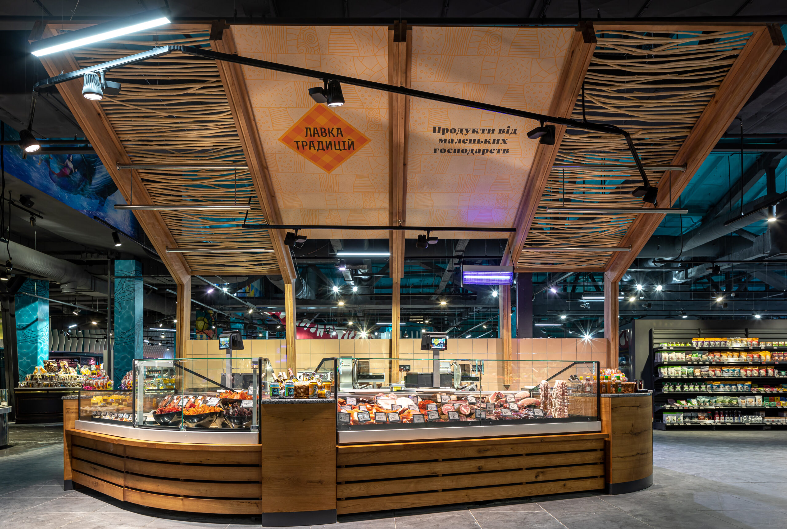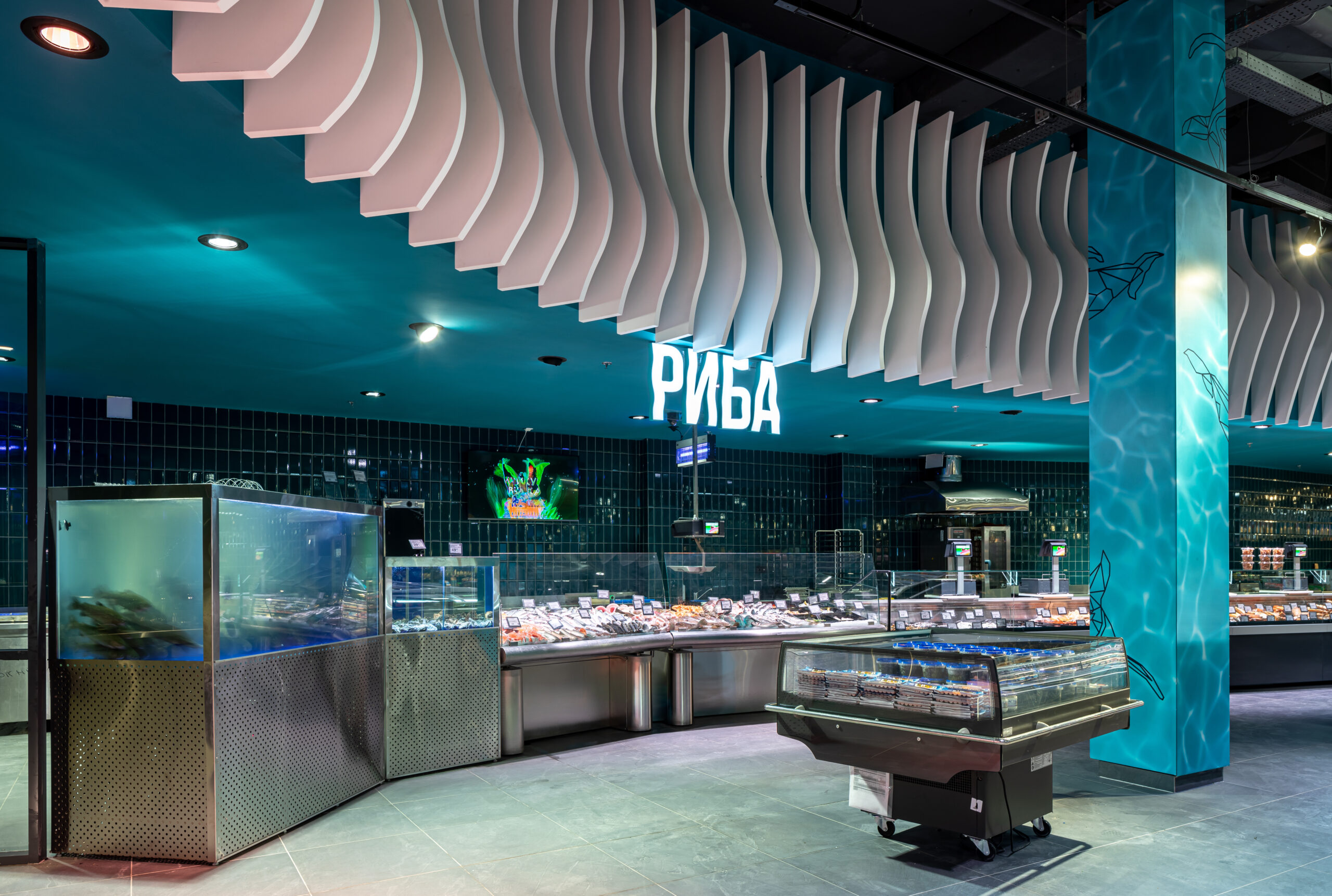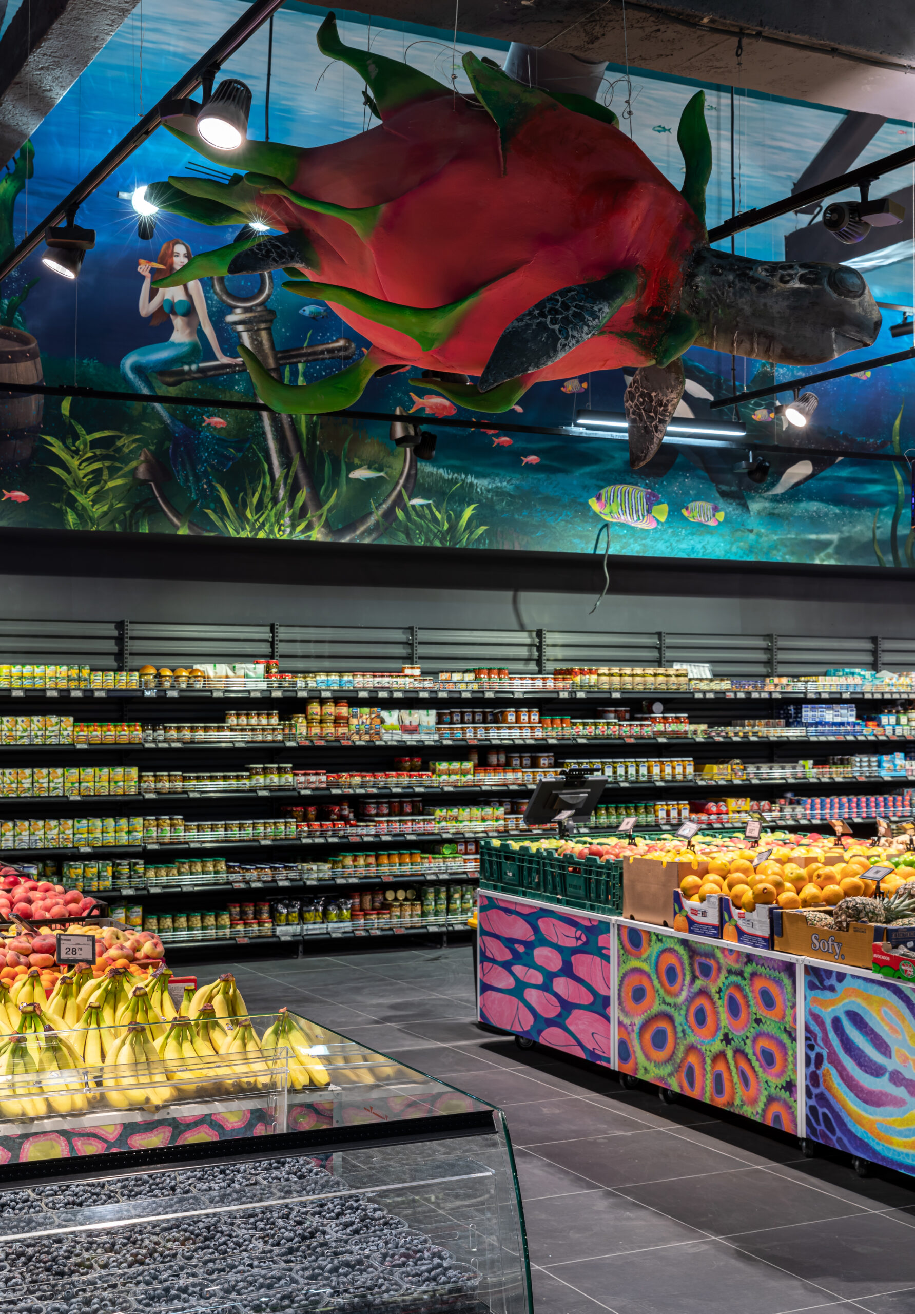 4418 м2 торгового залу – фантастична підводна подорож. Над відділом екзотичних овочів і фруктів пірнають дивовижні мешканці океану: скат-лимон, черепаха-ананас, черепаха-пітахайя, риби-їжаки з кошиками «Сільпо», а інтерактивний кіт з лохини пускає фонтан.