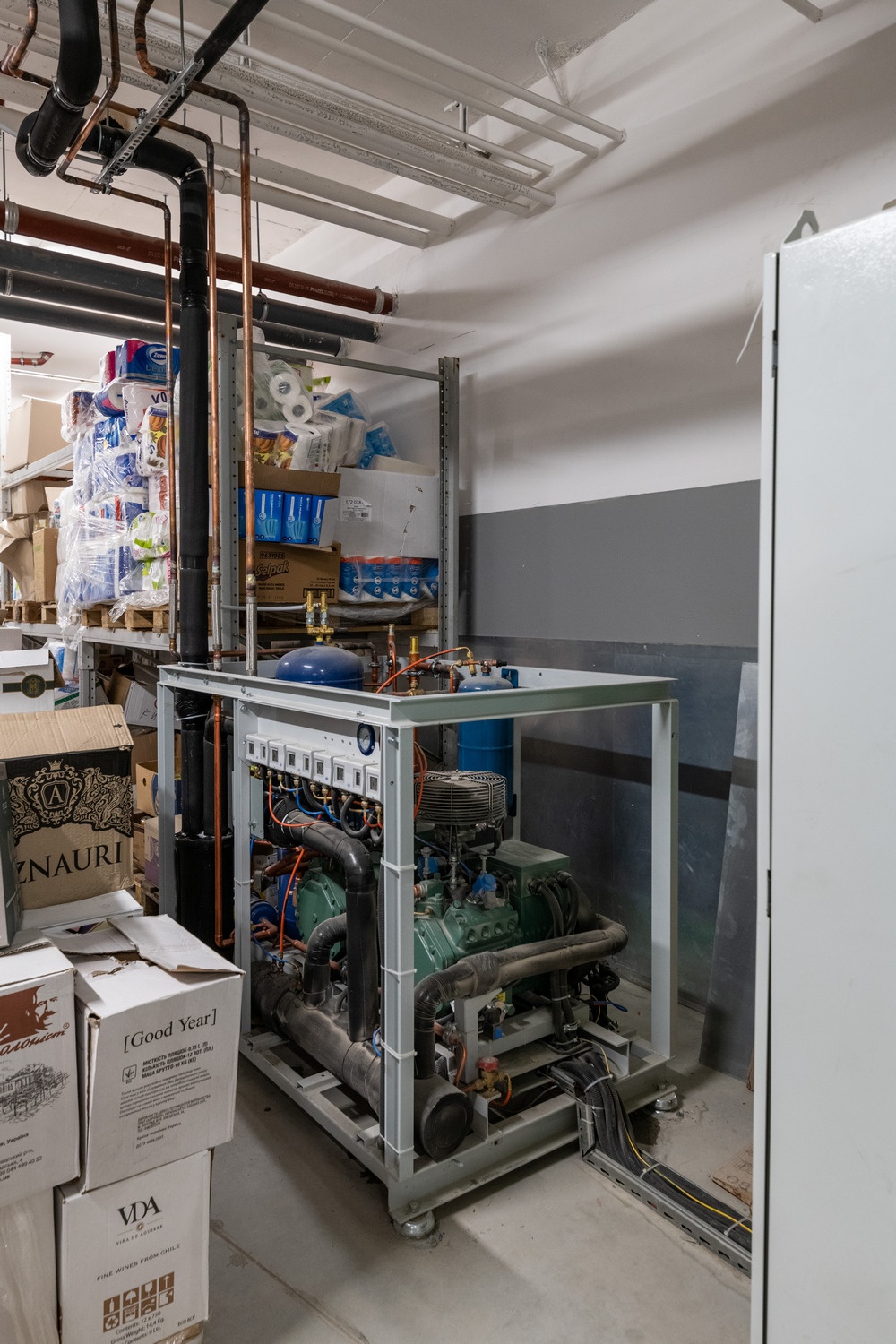 Але вітрини й інше торгове обладнання – лише верхівка роботи, виконаної Aisberg. До цього часу компанія вже виконала не один десяток замовлень, пов’язаних із розробкою та монтажем вітрин і техніки, спроектованих спеціально під вимоги замовника. Зараз же фахівцям довелося шукати рішення іншої проблеми: класична схема монтажу системи охолодження в Ultramarket на проспекті Перемоги була неможлива. Супермаркет знаходиться в житловому комплексі, тому, по-перше, були проблеми з пошуком відповідного приміщення для машинного відділення, а по-друге, треба було уникнути неминучих шуму і вібрацій, які турбували б мешканців.