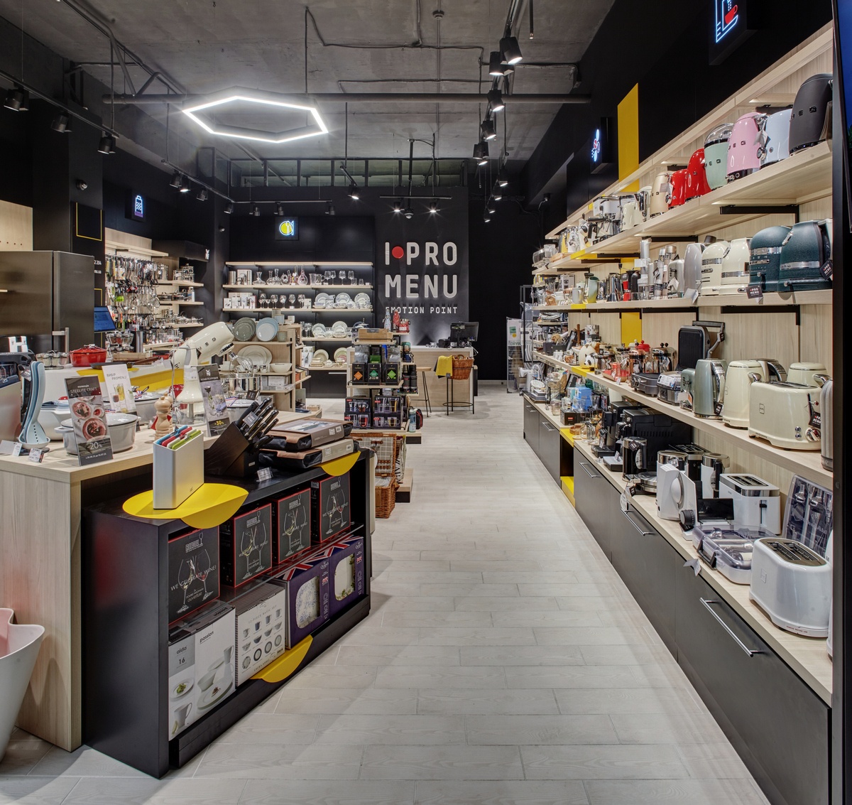Інтер’єр нового магазину має візуальне розділення на тематичні зони, кожна з яких присвячена окремій групі товарів. Мінімалістичні позначки допомагають зорієнтуватися серед усього асортименту, а формат відкритих полиць облегшує знайомство з товаром, аби відвідувачі могли власноруч оцінити переваги майбутньої покупки.