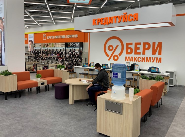 У центральній частині магазину облаштували сервісний хаб з точкою видачі інтернет-замовлень з foxtrot.ua, поруч – зону кредитування та великий лаундж-простір з безкоштовною кавою, дитячий куточок.