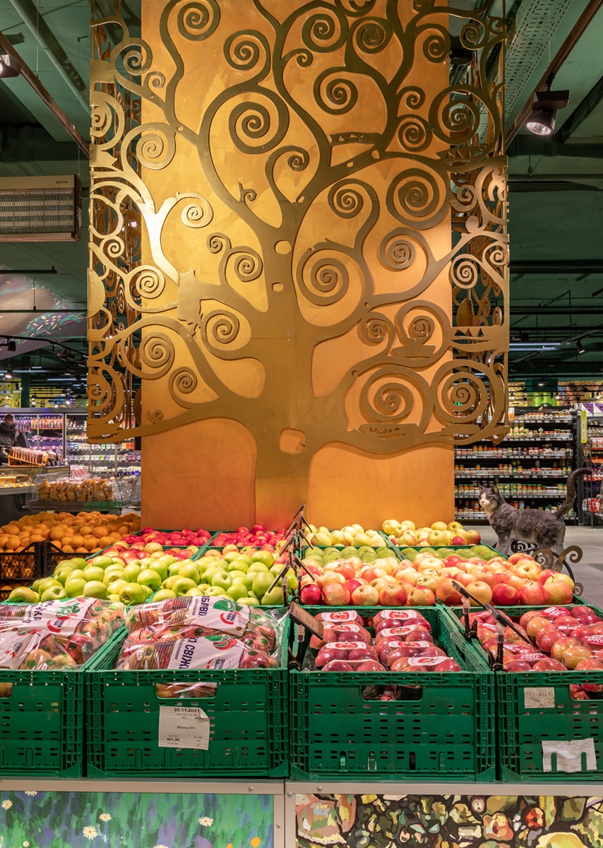 Одним із елементів декору стало дерево з картини «Дерево життя», на якому дозріли різні плоди і яке підкреслює різноманіття фруктів, представлених в магазині.