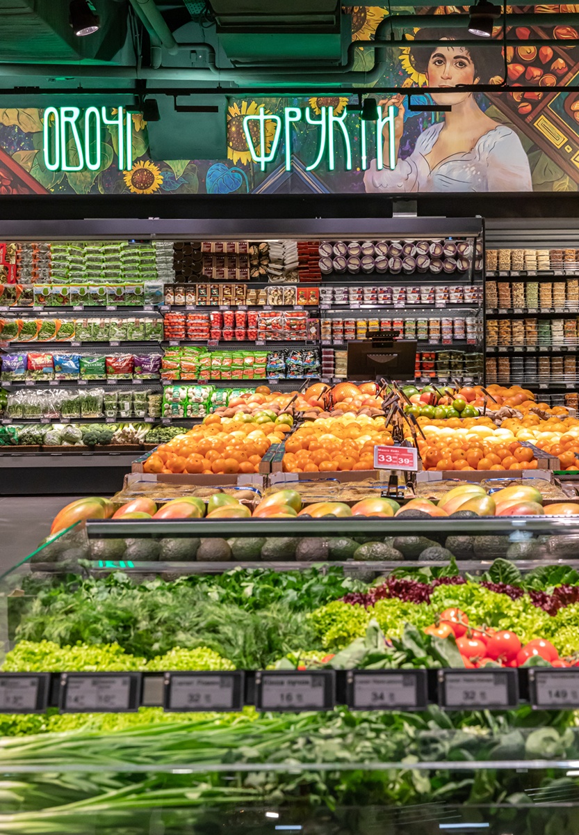 У супермаркеті площею 1238 квадратних метрів представлений великий асортимент продуктів Власного імпорту, зокрема і з Австрії, а також великий вибір свіжої риби та м’яса. А якщо не хочеться витрачати час на кухні за їх приготуванням, у відділі кулінарії можна обрати вже готову страву на будь-який смак.