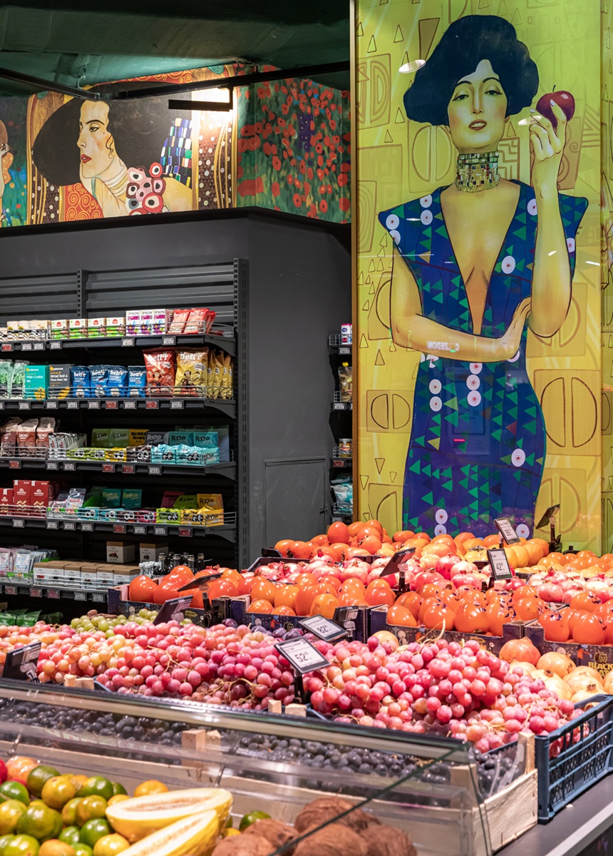 Особливістю саме цього магазину стали картини, які оживають. На вітринах над відділом гастрономії із вишуканим асортиментом м’ясних та сирних виробів за допомогою AR можна оживити портрет коханої художника та австрійської моделі Емілії Фльоге, зібрати маки у вінок або побачити справжнісінького Смаковершника на картині Клімта. Потрібно лише відсканувати QR-код, відкрити інстаграм-фільтр і навести смартфон на вітрину.