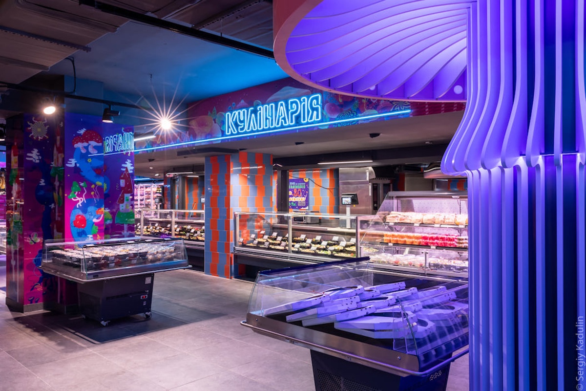 Для зручності неонові лазери підсвічують широкий асортимент у холодильниках. А вивіски у відділах — різні за стилем та також освітлюються неоновими лампами.