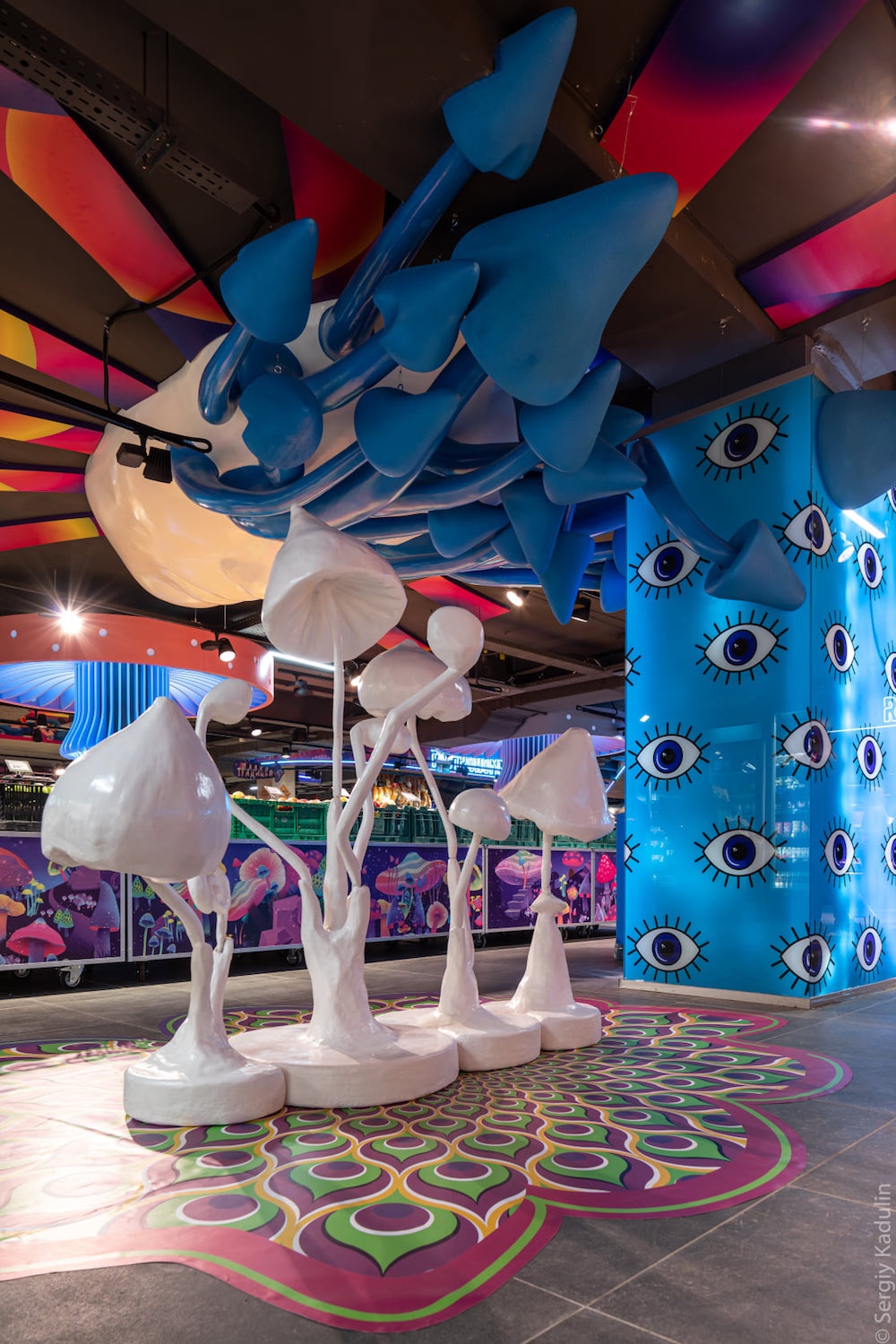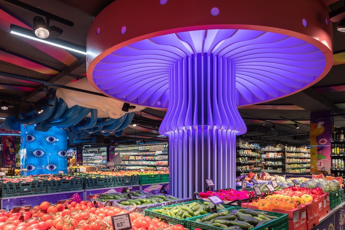 Завдяки унікальному дизайну супермаркету для відвідувачів шопінг перетвориться на прогулянку загадковим лісом з велетенськими неоновими грибами.