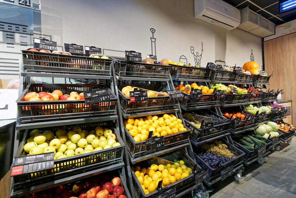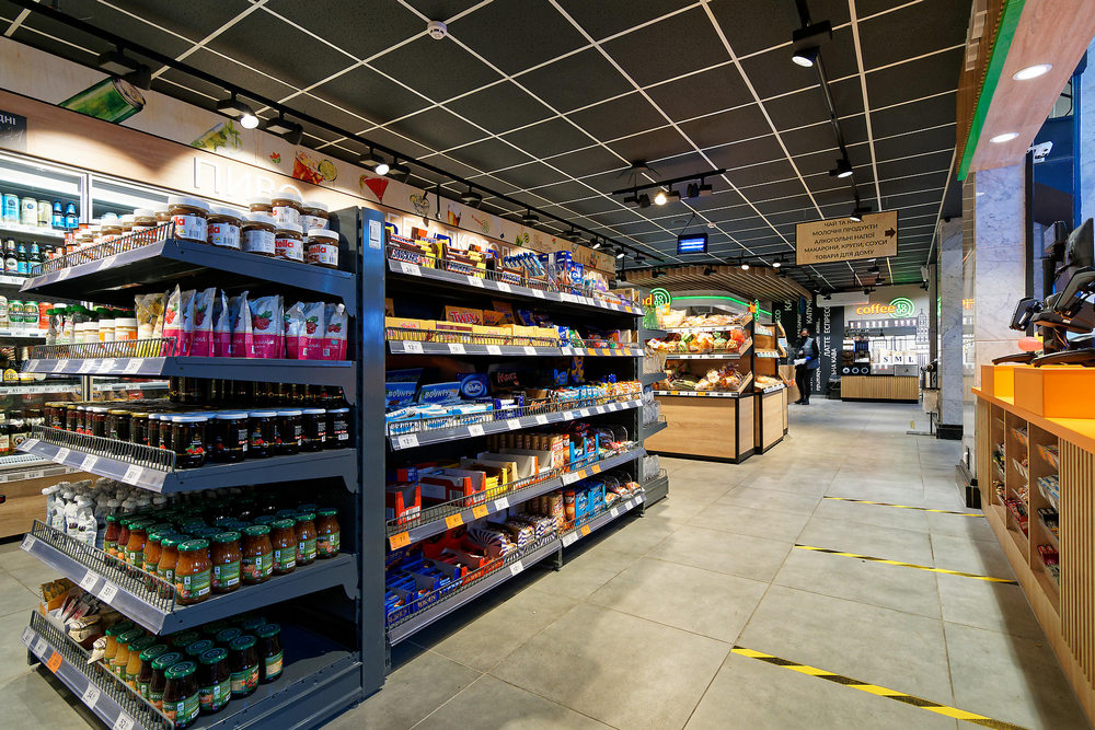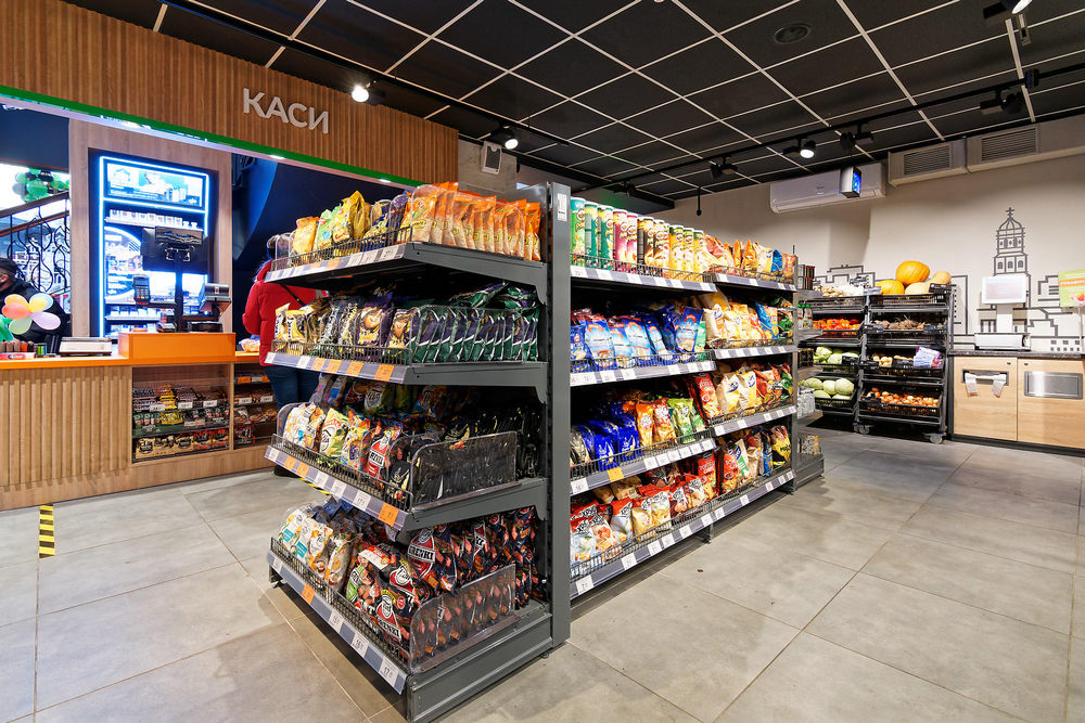 Окрім готових страв в магазині є полиці зі стандартним для супермаркету асортиментом товарів — овочами, фруктами, бакалією, заморозкою та господарськими товарами.