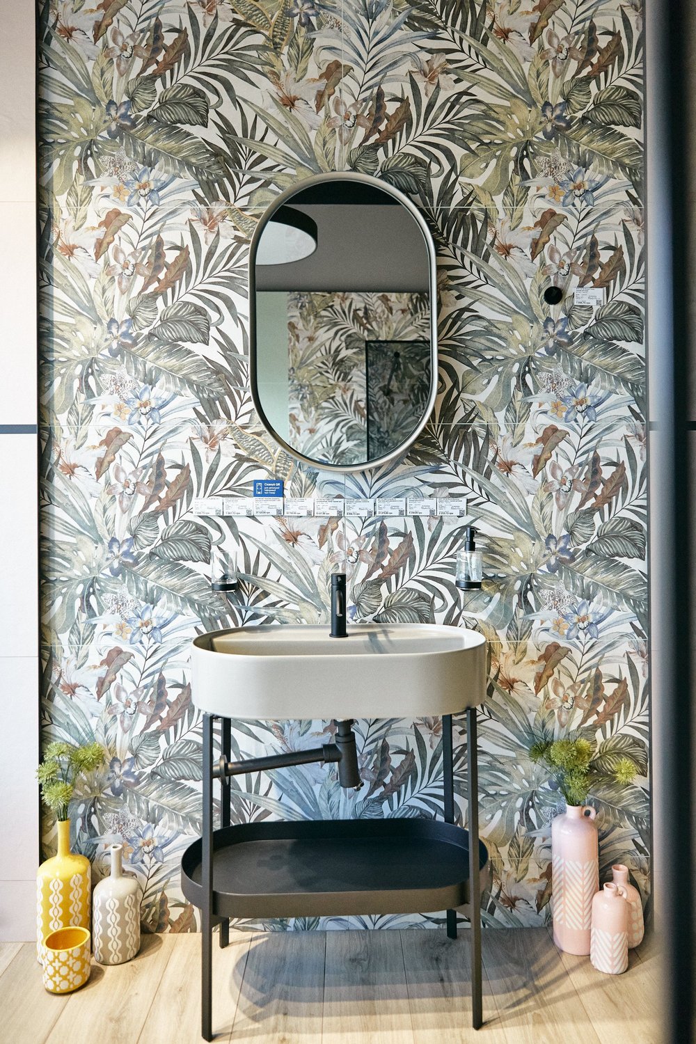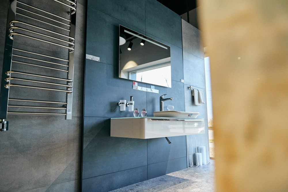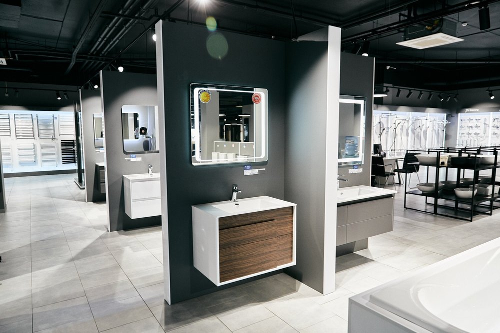 Окрема зона виділена під готові рішення для ванної кімнати, що є візитівкою Агромат. Значну частину магазину займають саме професійно оформлені шоу-руми, які покликані надати клієнтам безліч ідей, що і з чим комбінувати для створення стильного інтер’єру.