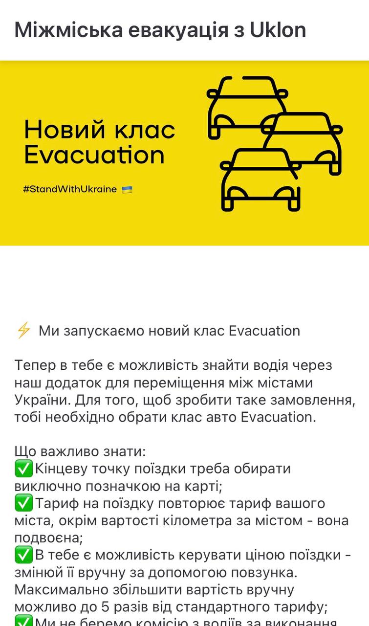 В мобільному застосунку Uklon з’явився новий клас авто Evacuation. Це машини, водії яких готові вивозити людей в інше місто та область, зокрема з гарячих точок, де йдуть бої.