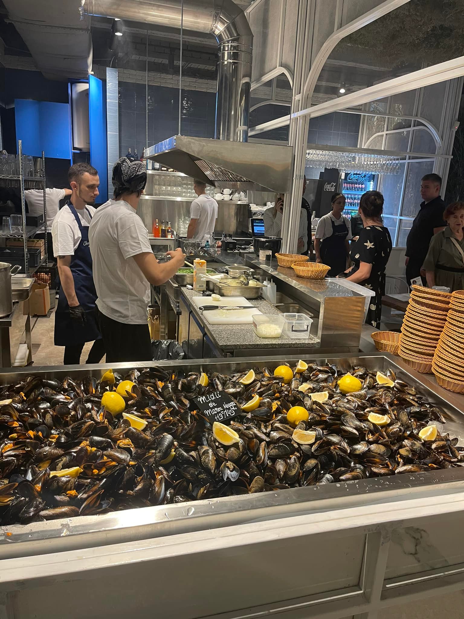 В меню пропонують креветок, устриць, рибу та багато мідій. На честь відкриття при замовленні двох порцій мідій третю ресторан пропонує у подарунок.