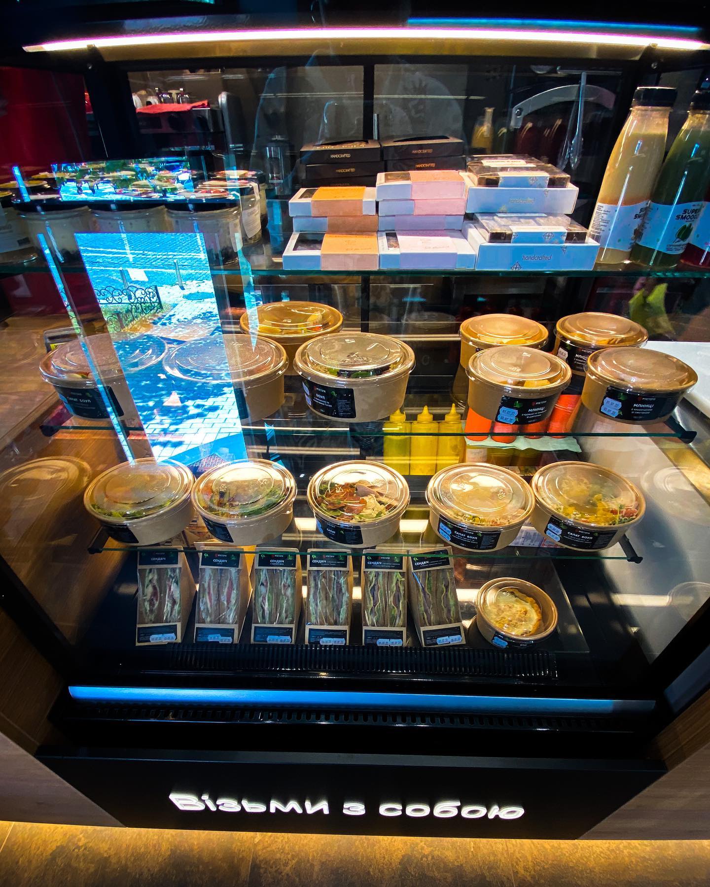 Перша М`ясторія у форматі Meat Bar відкрилась в самому серці Києва на Софійській площі. Це затишний сучасний заклад, сюди можна зайти за фірмовими стравами на виніс або швидко перекусити на місці. Тут можна замовити томлене м`ясо і гарніри, м`ясні бокси та соковиті бургери, шашлик і “м`ясторіс” (м`ясо з овочами та соусом у тонкому лаваші, підсмаженому на грилі). Ніякого очікування офіціанта – готові свіжі страви та напої чекають, що ви візьмете їх із вітрин та полиць.