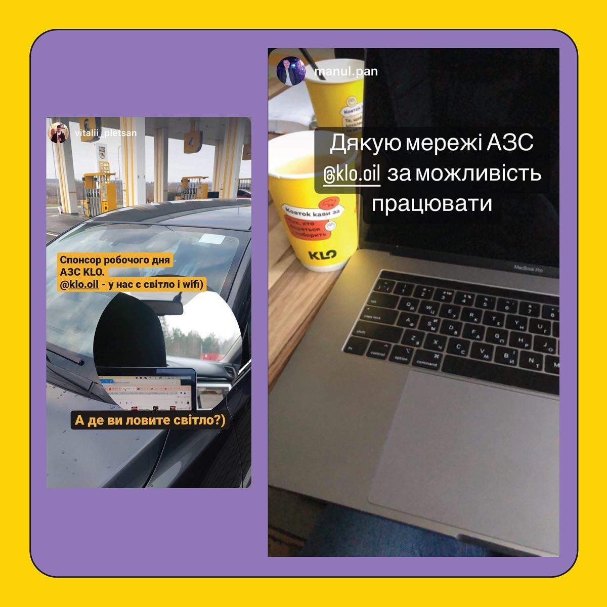 З 3 листопада мережа АЗК KLO почала облаштовувати на території своїх автозаправних станцій умови для коворкінгів. Регулярні відключення світла стали проблемою для тих людей, чия робота пов’язана з інтернетом. У пошуках місць, які можуть поділитися електроенергією і Wi-Fi, вони опиняються в самих незвичних для роботи просторах. В KLO швидко зметикували і стали таких робітників запрошувати приходити працювати до себе. “Наше світло — твоє світло. Наш інтернет — твій інтернет. Наша кава — твоя кава. Тепер в українців все спільне, бо тільки разом ми зможемо подолати усі перешкоди”, – заявили в компанії.