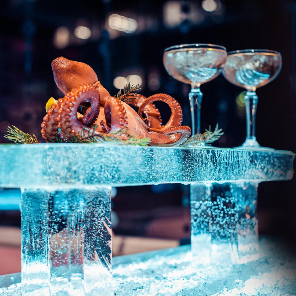 Головна концепція Red Ice Bar — це лід і червоний колір. В закладі алкоголь подають в льодяних чарках, а холодні страви — на льодяних тарілках. В меню пропонують карпаччо з восьминога, холодний ростбіф з оливами та цвітною капустою, качине філе з печеним гарбузом, різні напої та інше. Також у барі можна замовити незвичну послугу — заморозку фотографії або подарунка в кубі льоду.