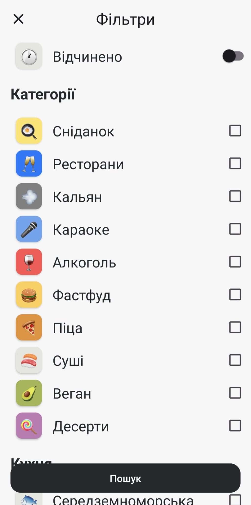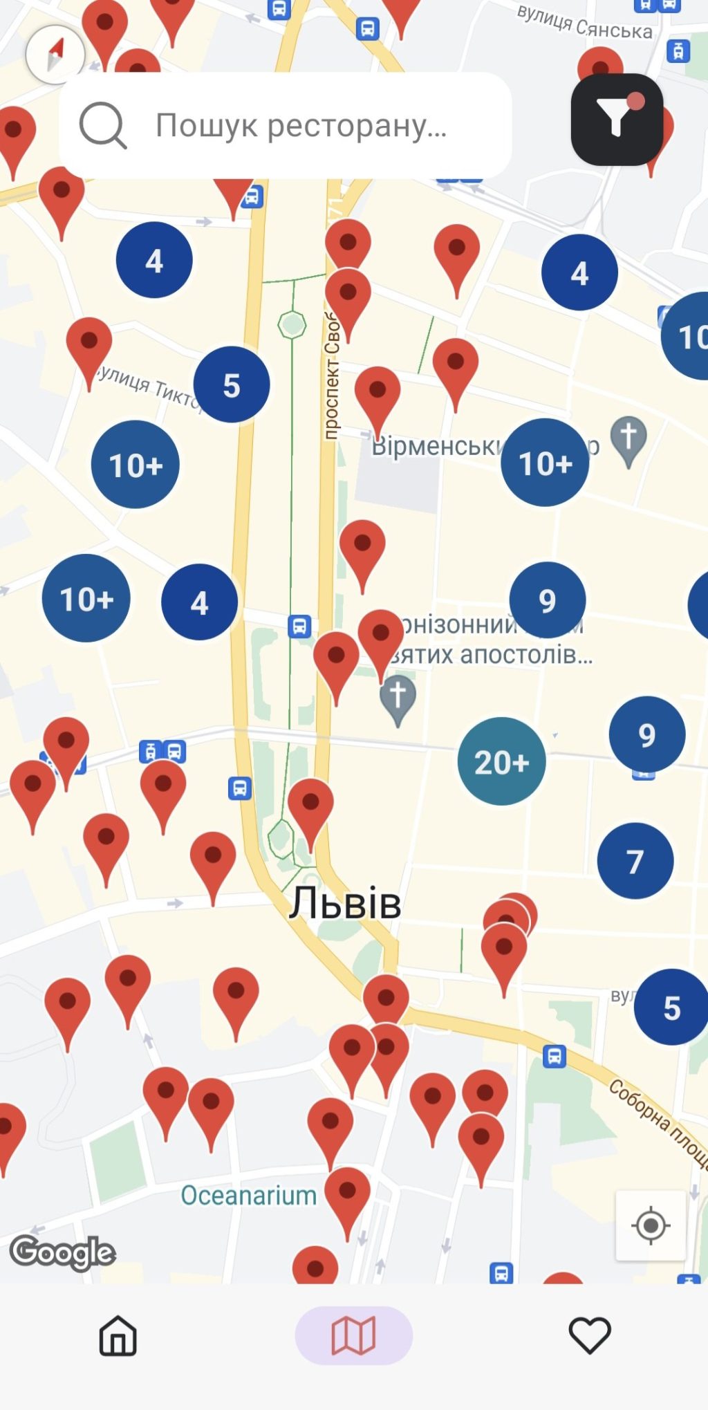 Шукати ресторани можна на карті або за допомогою фільтра. Після вибору можна переглянути меню, забронювати столик і дізнатися деталі про заклад.