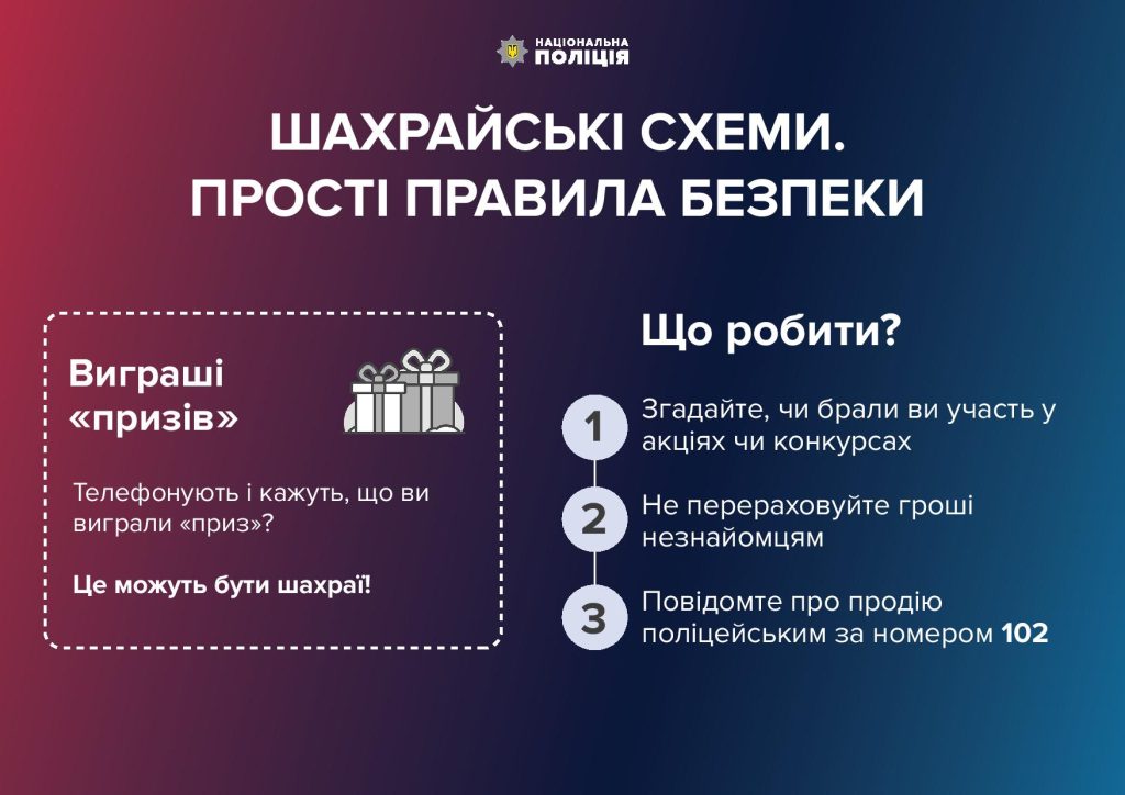 «Ви виграли автомобіль або побутову техніку» – не поспішайте виконувати всі настанови незнайомців. Зазвичай у надісланому sms вказаний номер, за яким можна отримати детальну інформацію. Коли телефонуєте, вам розповідають умови, які потрібно виконати, щоб отримати «приз». Як правило, вам пропонують сплатити 1% від вартості виграного товару. Але як тільки ви це зробите, незнайомці перестають виходити на зв’язок і зникають. Пам’ятайте: так діють шахраї.