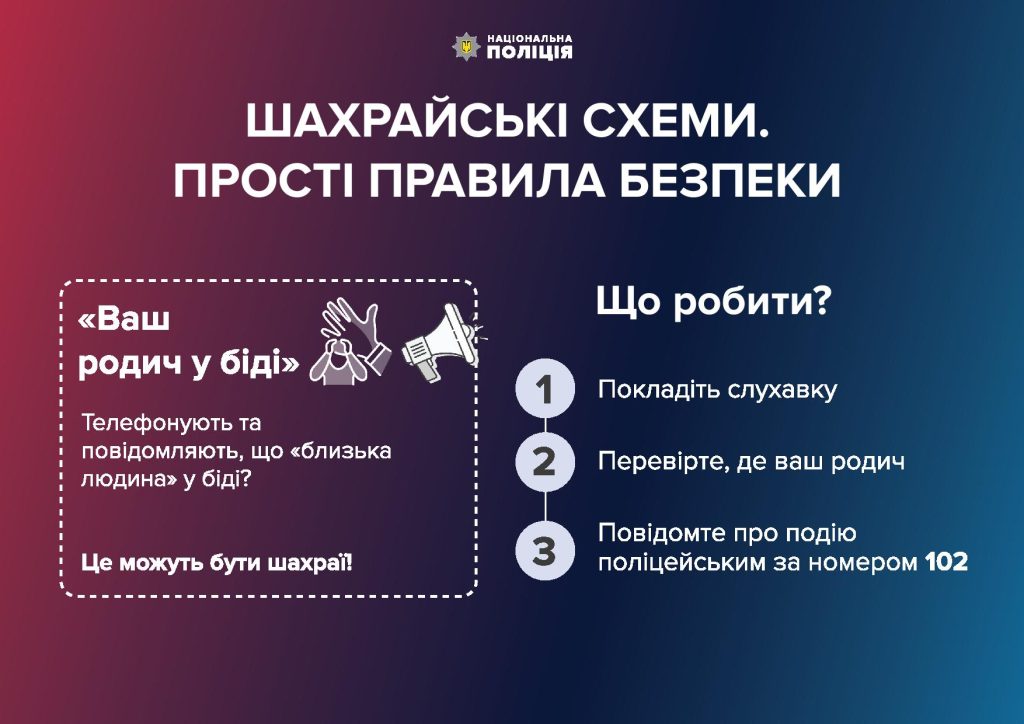 Якщо вам телефонують (часто вночі або вранці) та повідомляють, що родич потрапив у біду, і просять передати гроші – це шахрайство. Зловмисники можуть видавати себе за сина або дочку, онука чи онучку, які начебто потрапили у біду (скоїли ДТП, опинилися у поліції тощо). Шахраї можуть представлятися лікарями або поліцейськими і пропонувати свою допомогу у вирішенні «проблеми» за винагороду, яка може становити від 1000 до 10 000 грн, а інколи навіть кілька тисяч доларів США. Пам’ятайте: так діють шахраї.