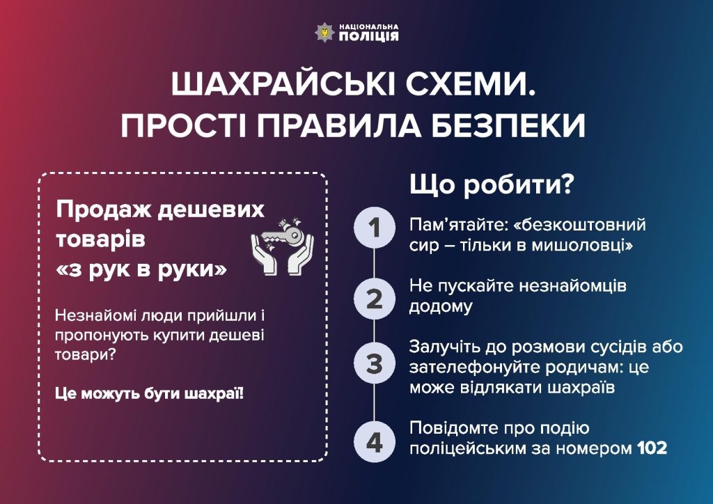 Якщо до вас прийшли незнайомі люди і пропонують купити дешеві товари – будьте насторожі. Це можуть бути шахраї. У такий спосіб вони намагаються дізнатися, де ви зберігаєте свої заощадження, а потім непомітно для вас викрасти гроші. Пам’ятайте: «безкоштовний сир – тільки в мишоловці. І тільки для другої мишки».