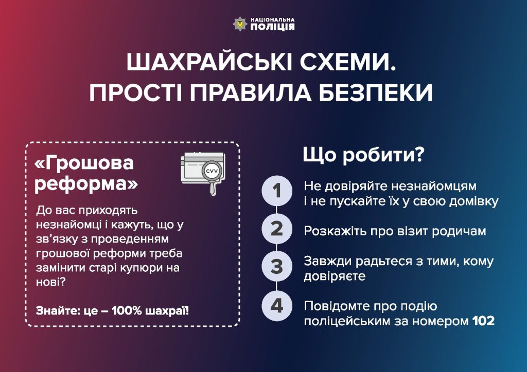 - Якщо до вас приходили шахраї, повідомте про це поліцейським за номером 102.