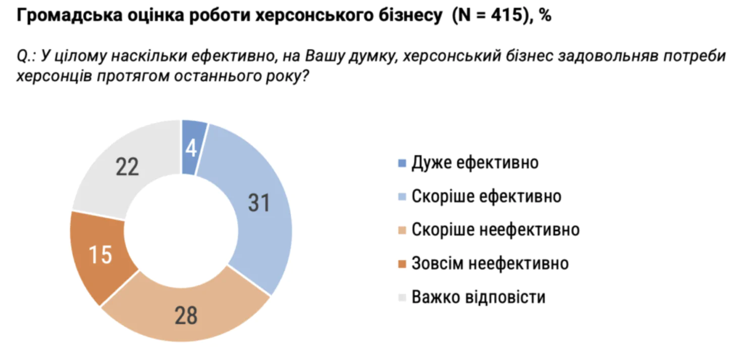 Так, лише 35% херсонців відповіли, що місцевий бізнес впорався зі своїми задачами, ще 43% відповіли на запитання негативно, а 22% респондентів не змогли зробити таку оцінку.