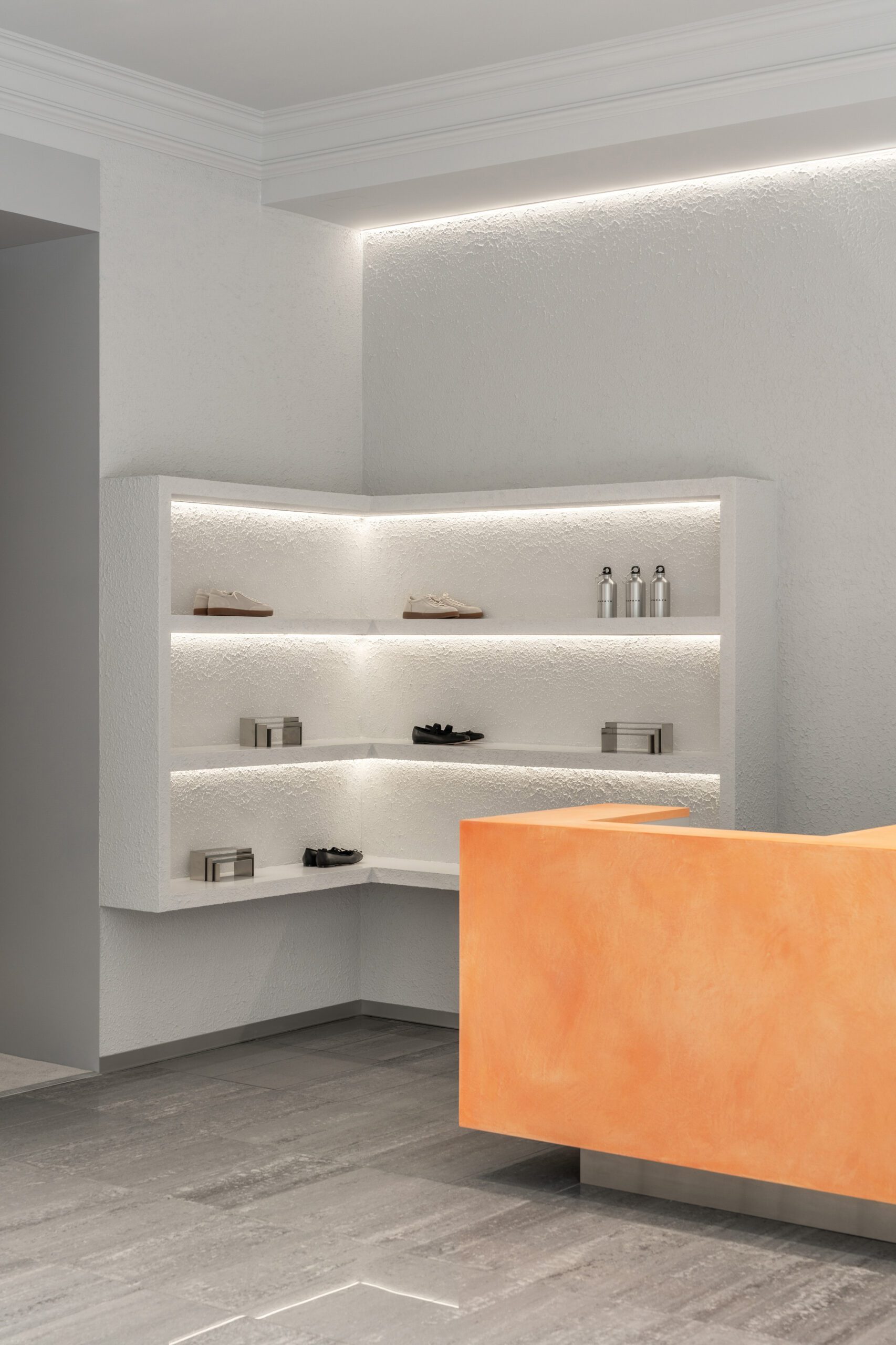 Меблі виготовлені в відтінку Pantone, який має символічну назву Papaya. Вони мають не лише декоративну функцію, наприклад, широка та довга форма столу дозволяє розглядати деталі та елементи одягу.