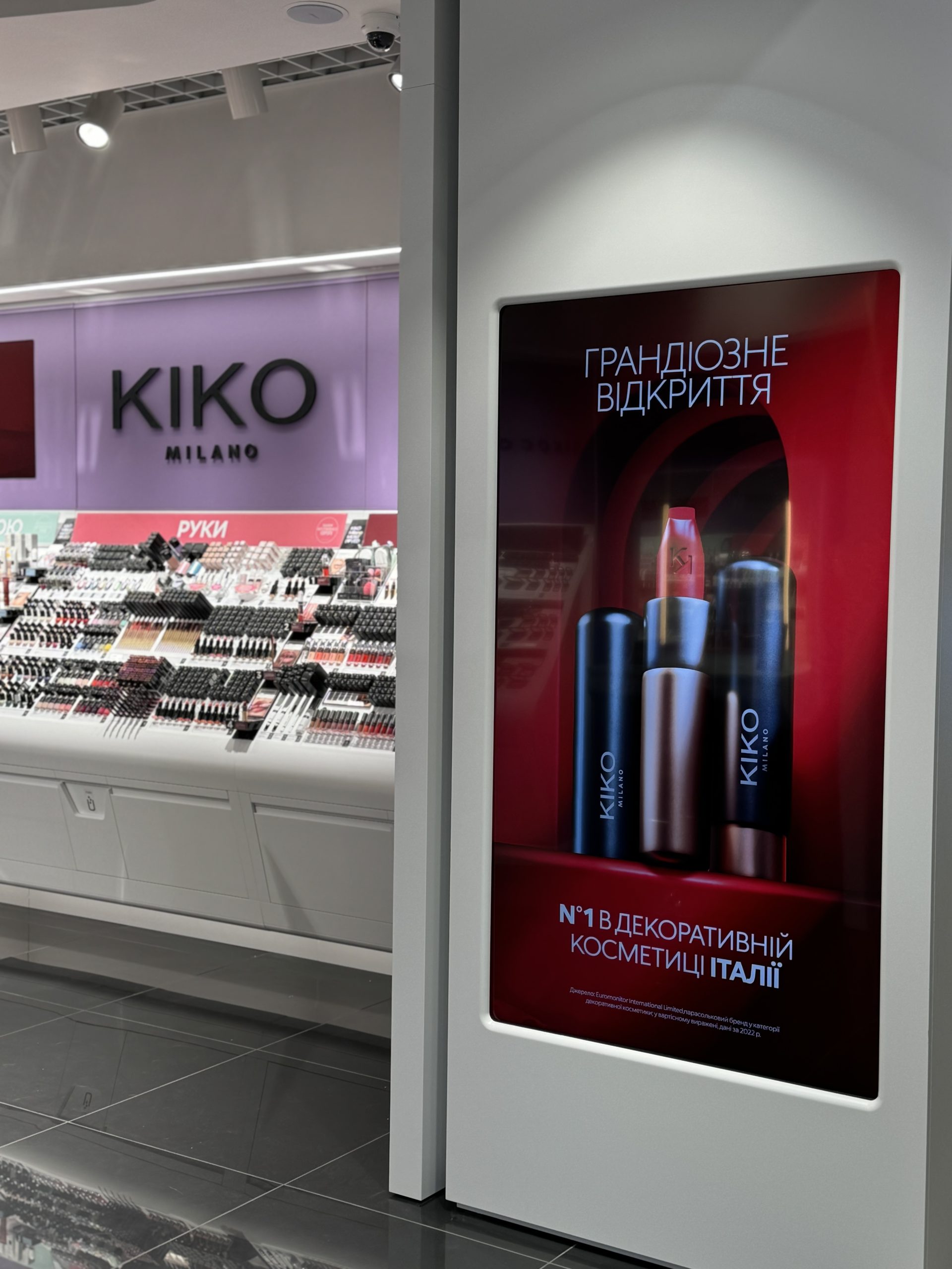 Також магазини Kiko Milano працюють у Києві, Дніпрі, Харкові, Одесі, Луцьку, Вінниці, Полтаві, Черкасах та Івано-Франківську, Рівному та Львові.