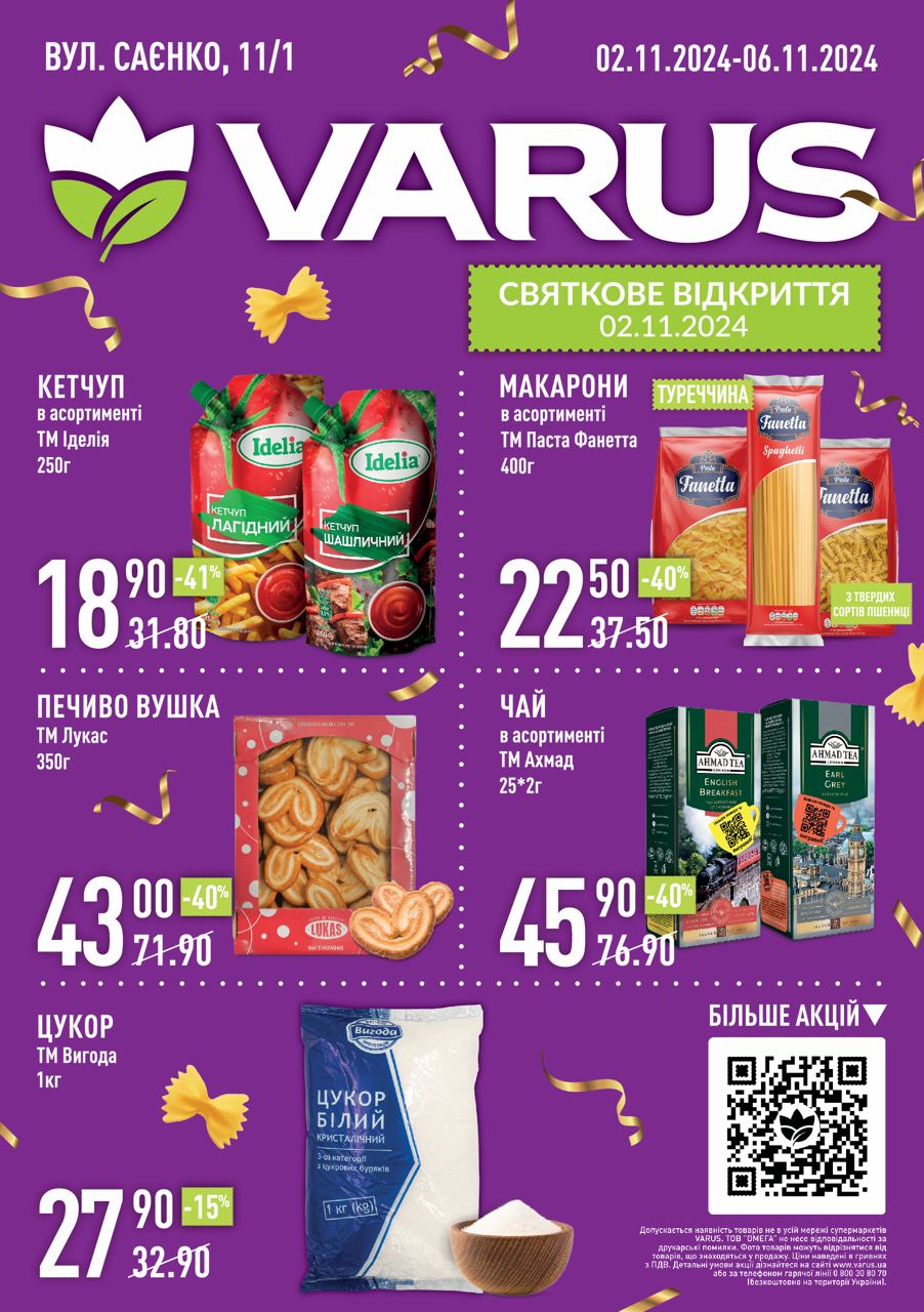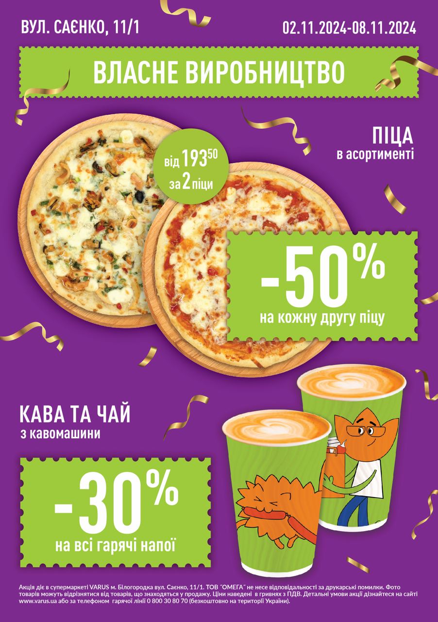 На святковому відкритті 2 листопада відвідувачів чекатимуть ексклюзивні пропозиції та акції! Перші 100 гостей отримають подарункові набори з продукцією від власних торгових марок — ТМ Varto та ТМ Вигода. А також будуть вигідні знижки — -30% на весь асортимент кави та напоїв. Не пропустіть особливу пропозицію у VARUS CAFE: купуйте дві піци та отримуйте другу зі знижкою -50%. А кожен, хто здійснить покупку на суму від 250 грн, отримає сертифікат на 50 грн для наступного візиту.
