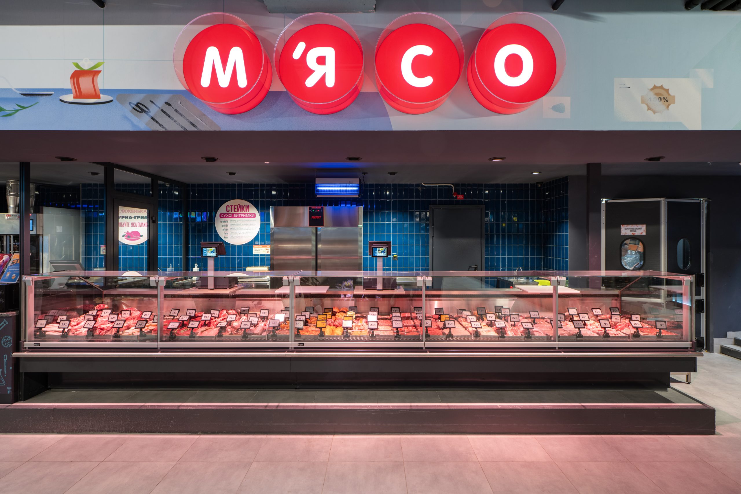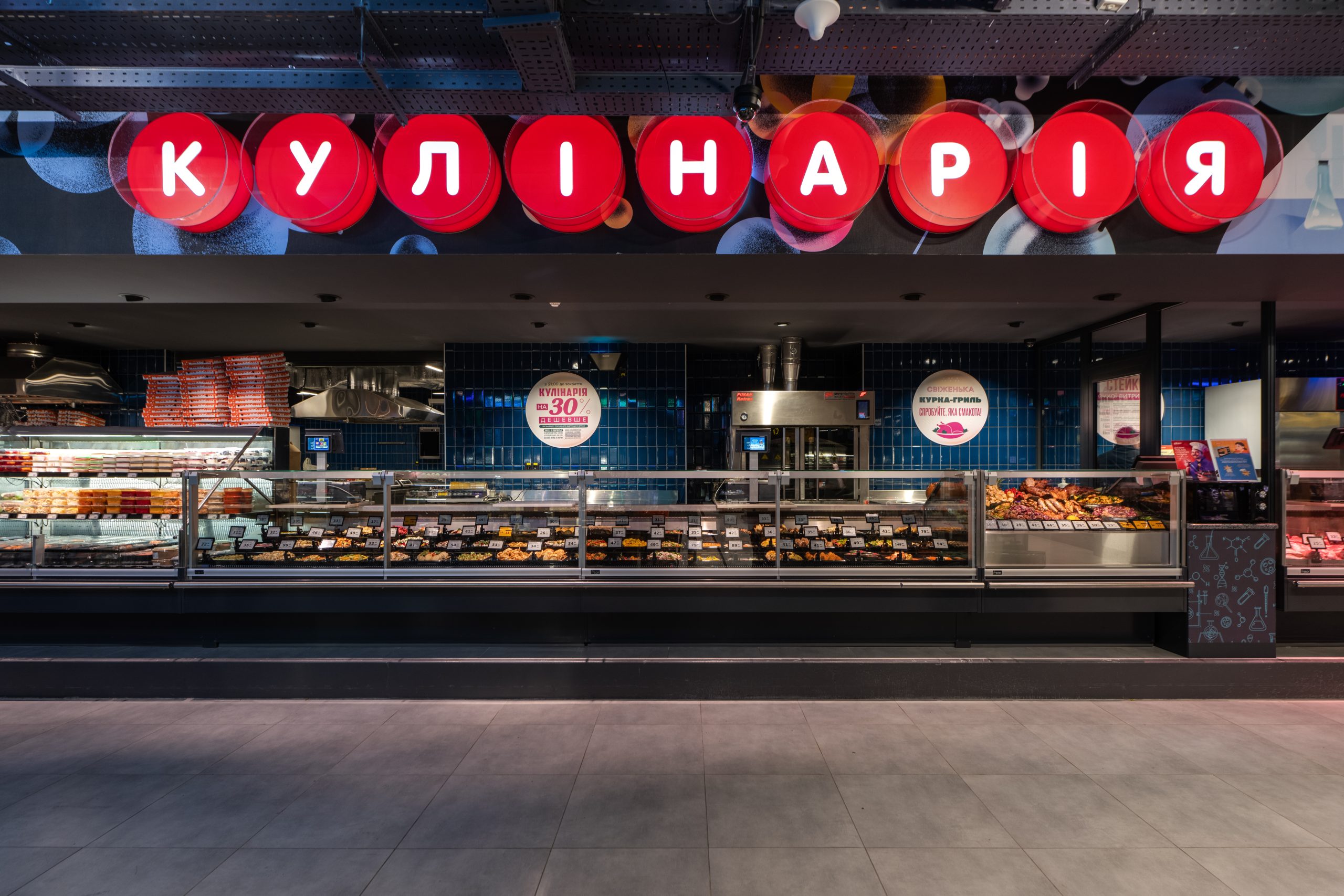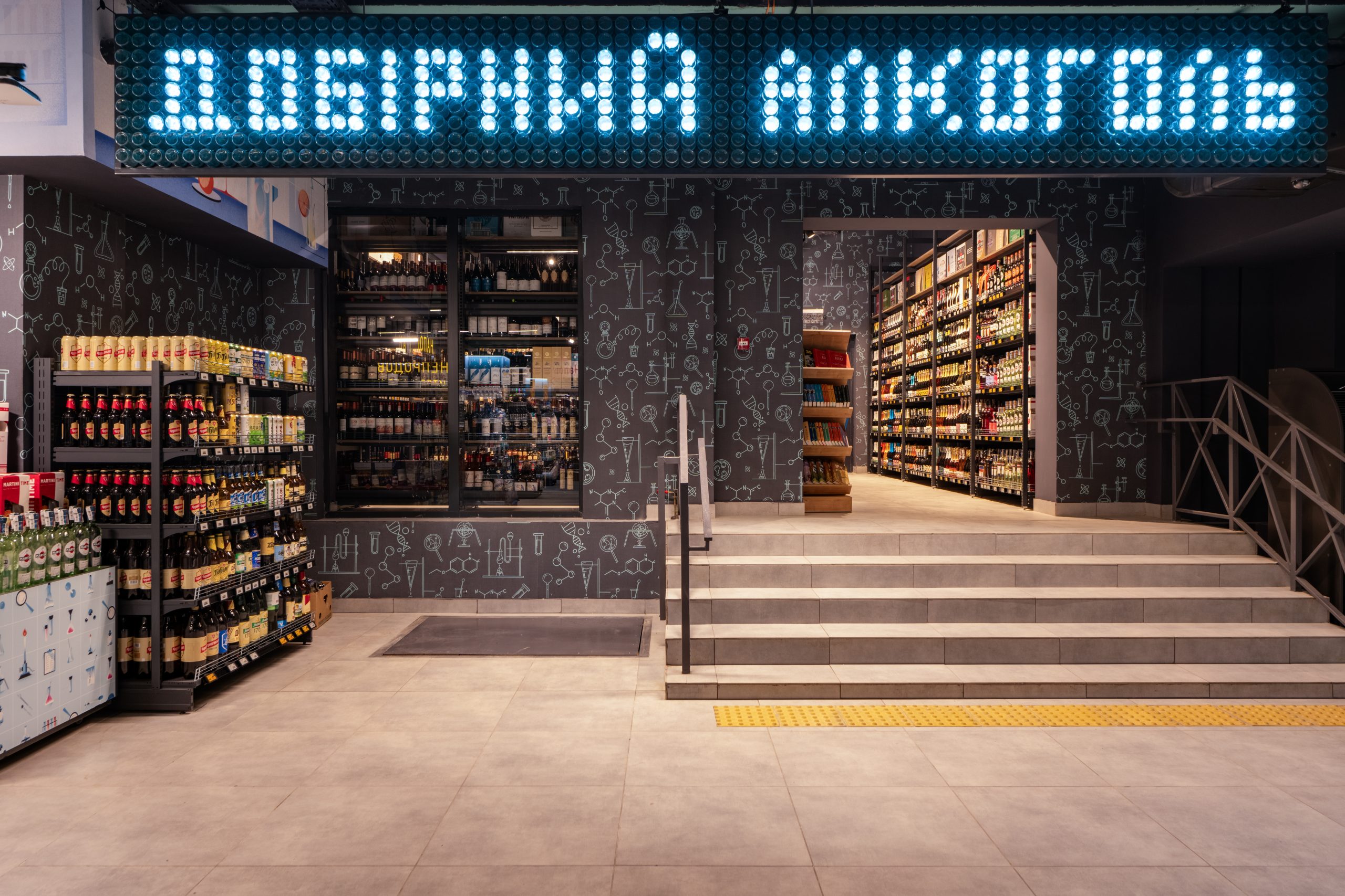 Кожен елемент інтер’єру розповідає свою історію про трансформацію звичних продуктів у щось надзвичайне. Замість вивісок — чашки Петрі, в яких відбувається магія розкладання продуктів на молекули. У відділі овочів та фруктів — символ ДНК як натяк на те, що кожен продукт має свій унікальний код смаку. Алкогольний відділ — це ніби окрема лабораторія з інсталяцією колб, які створюють атмосферу справжнього наукового центру.