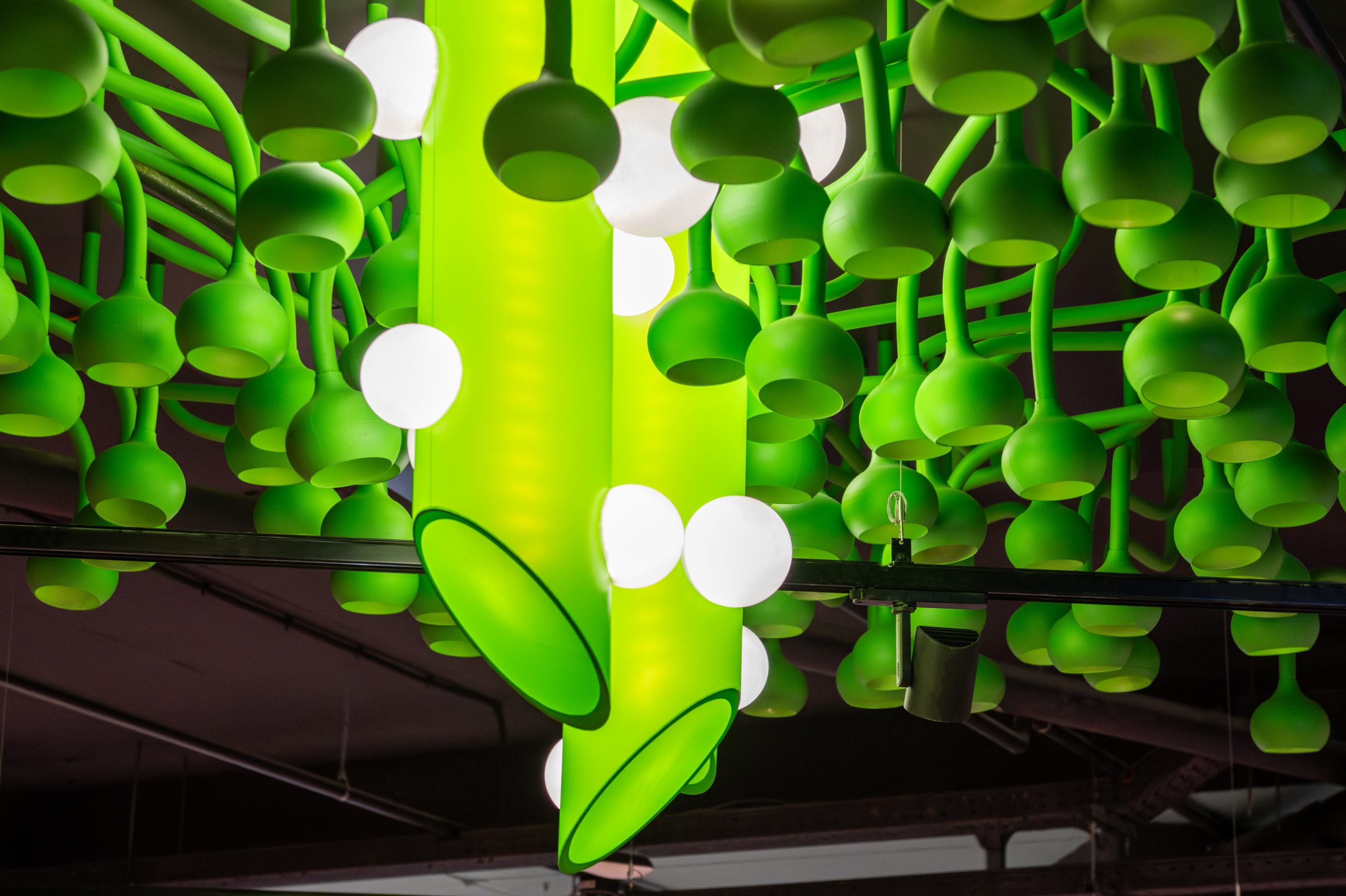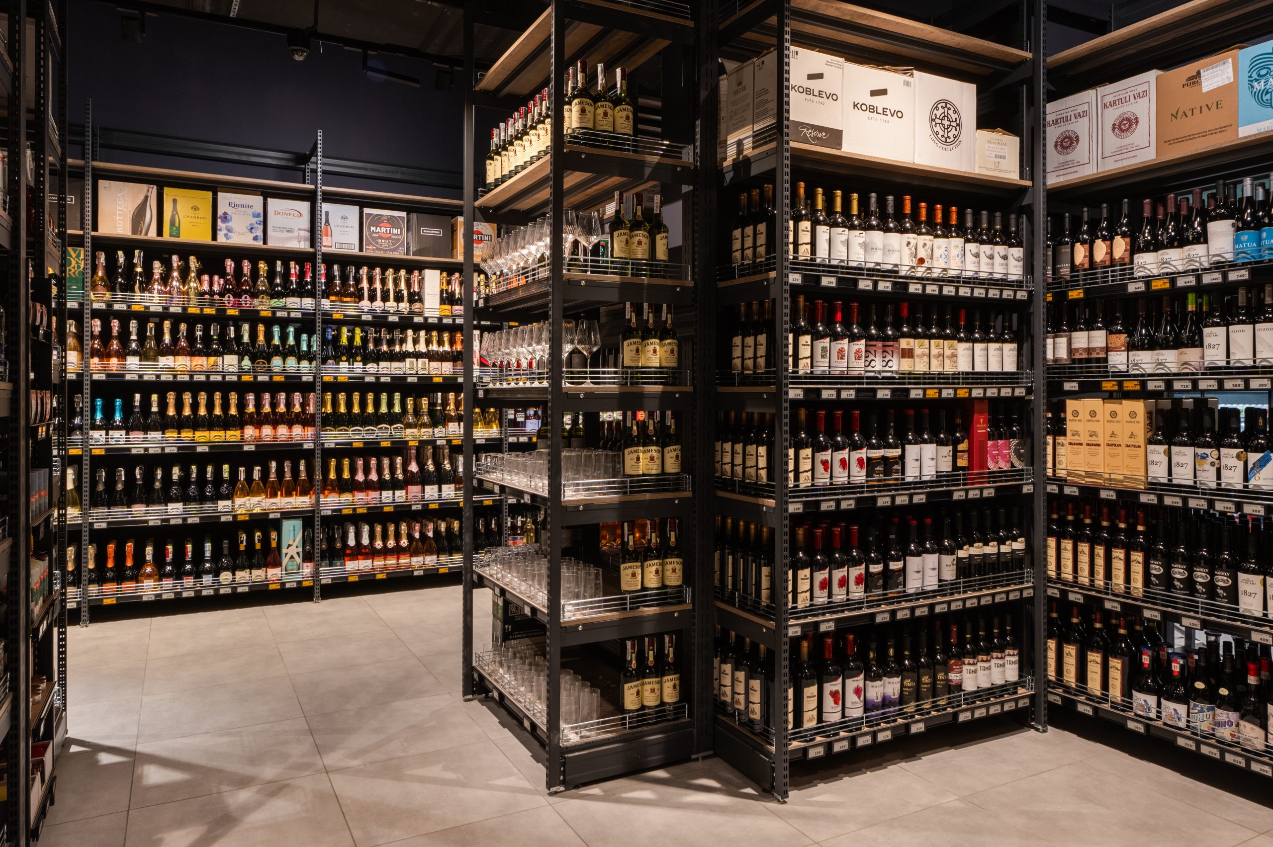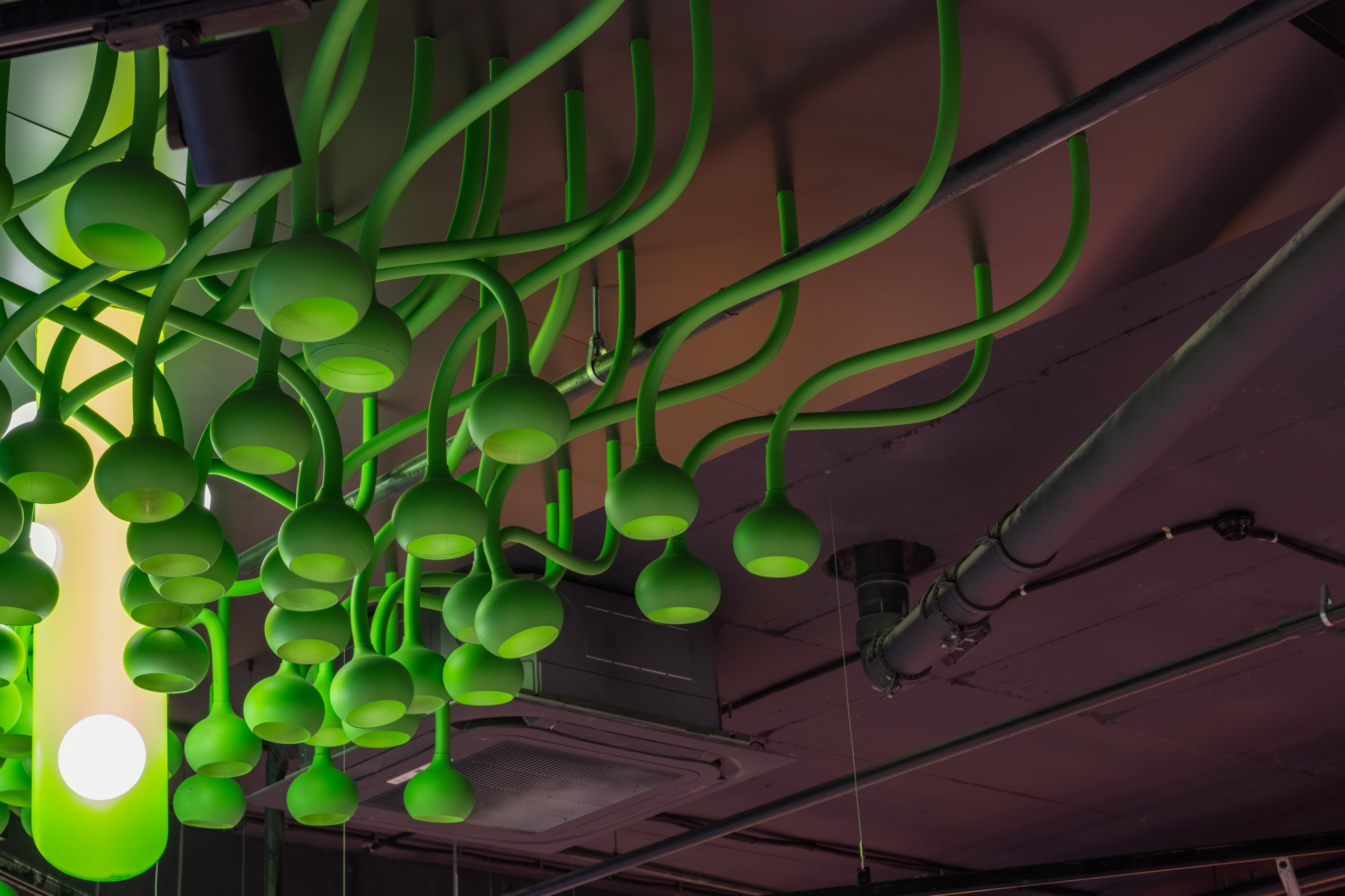 Кожен елемент інтер’єру розповідає свою історію про трансформацію звичних продуктів у щось надзвичайне. Замість вивісок — чашки Петрі, в яких відбувається магія розкладання продуктів на молекули. У відділі овочів та фруктів — символ ДНК як натяк на те, що кожен продукт має свій унікальний код смаку. Алкогольний відділ — це ніби окрема лабораторія з інсталяцією колб, які створюють атмосферу справжнього наукового центру.