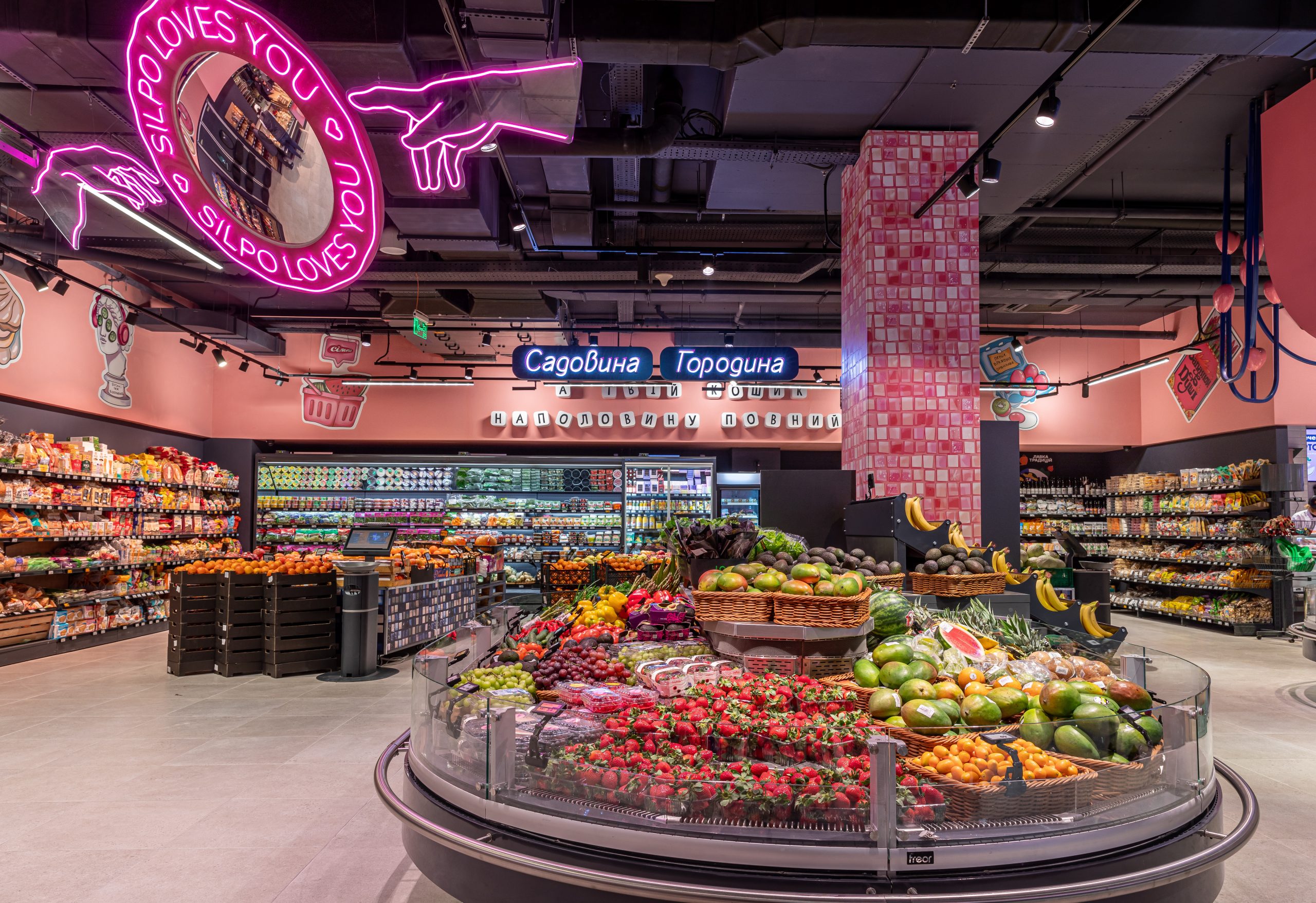 Уже на вході до супермаркету на Гостей чекають велетенські окуляри, крізь призму яких можна подивитися на світ у рожевому кольорі. Інтер’єр магазину доповнюють декор та ілюстрації про любов і турботу про себе. Зокрема, в магазині є інтерактивний борд з «Щастинками дня» — короткими фразами, які мотивують попіклуватися про себе та близьких: «Гарненько виспатись» або «Взяти в офіс смаколиків».