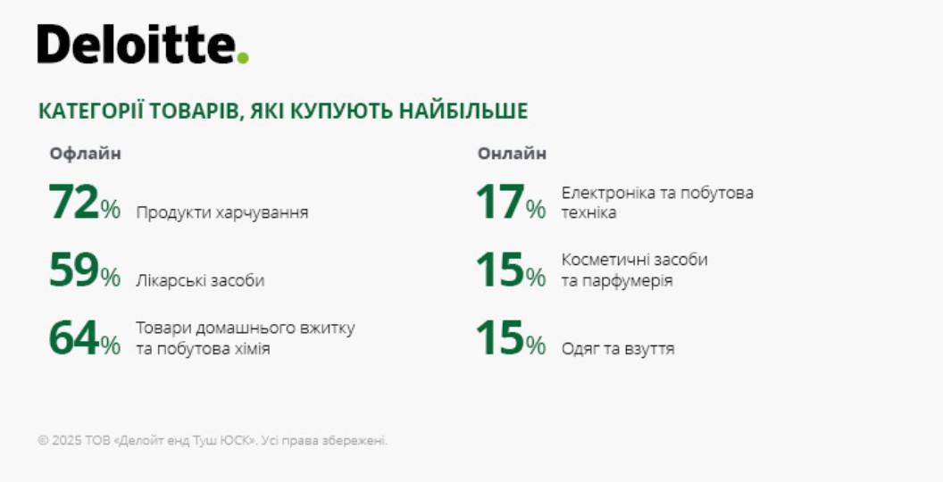Онлайн-шопінг набуває популярності, але традиційні магазини залишаються основним каналом закупівель для більшості категорій товарів.
