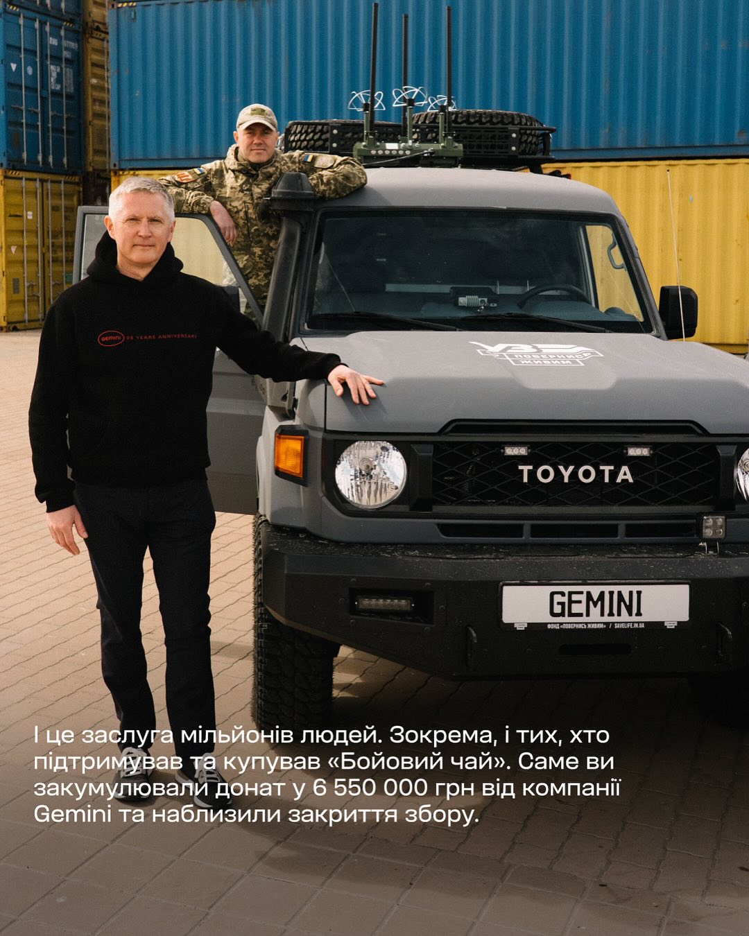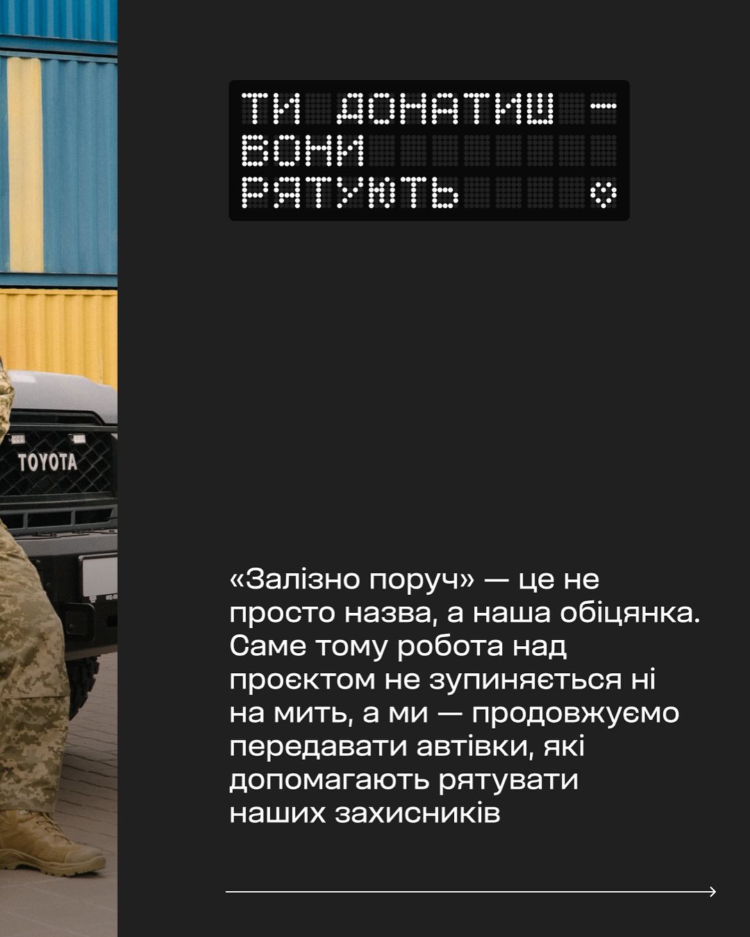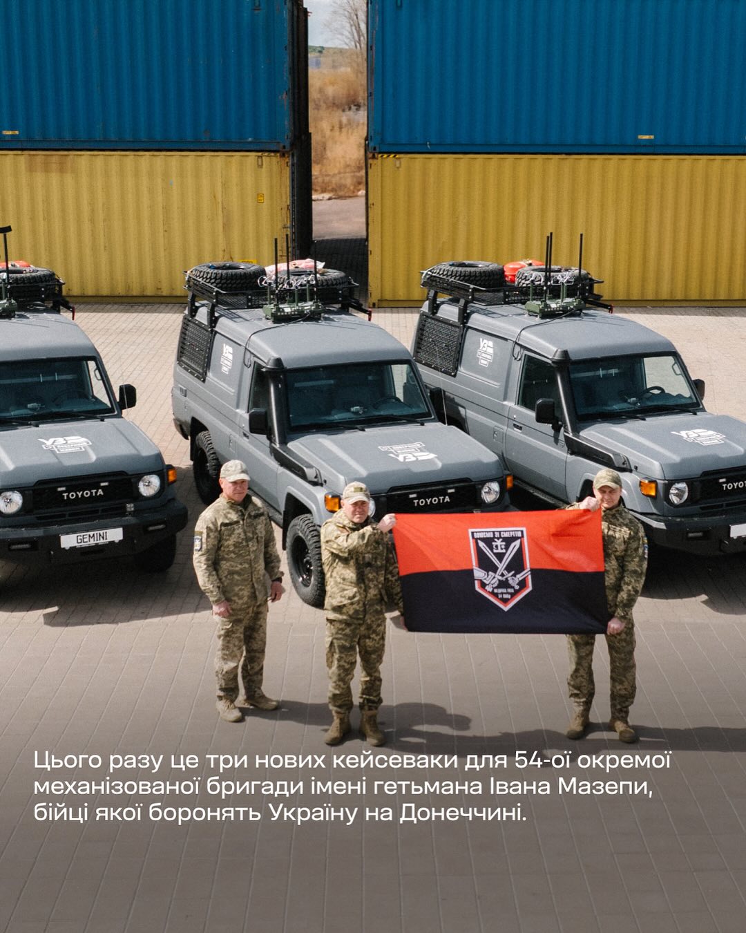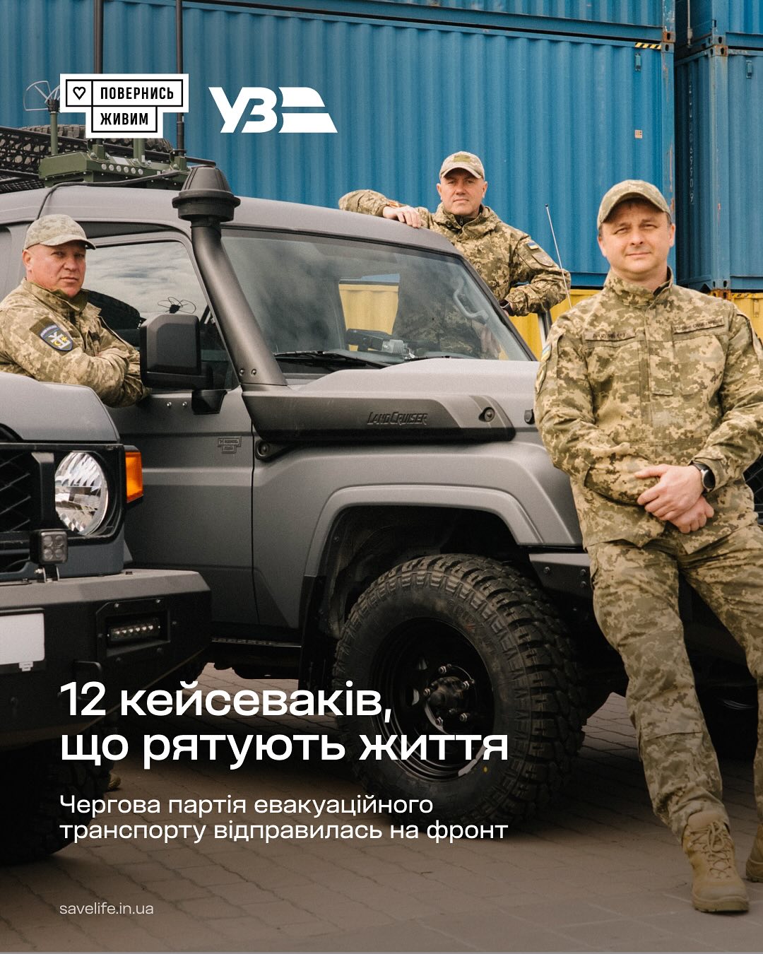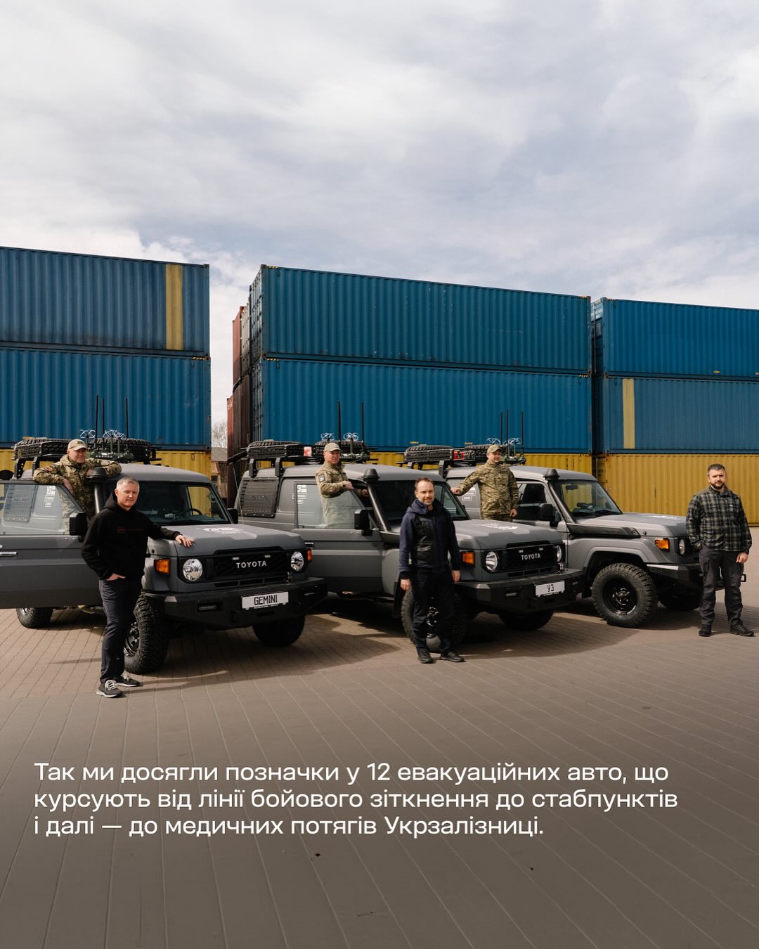 Завдяки тому, що триває проєкт «Залізно поруч» благодійний фонд «Повернись живим» та Укрзалізниця продовжують передавати на фронт автівки, які допомагають рятувати наших захисників. Тепер сумарно вже 12 машин курсують від лінії бойового зіткнення до стабпунктів і далі — до медичних потягів Укрзалізниці. І це заслуга мільйонів людей. Зокрема, і тих, хто підтримував та купував «Бойовий чай». Нові авто отримала 54-та окрема механізована бригада імені гетьмана Івана Мазепи на території мультимодального залізничного термінального комплексу.