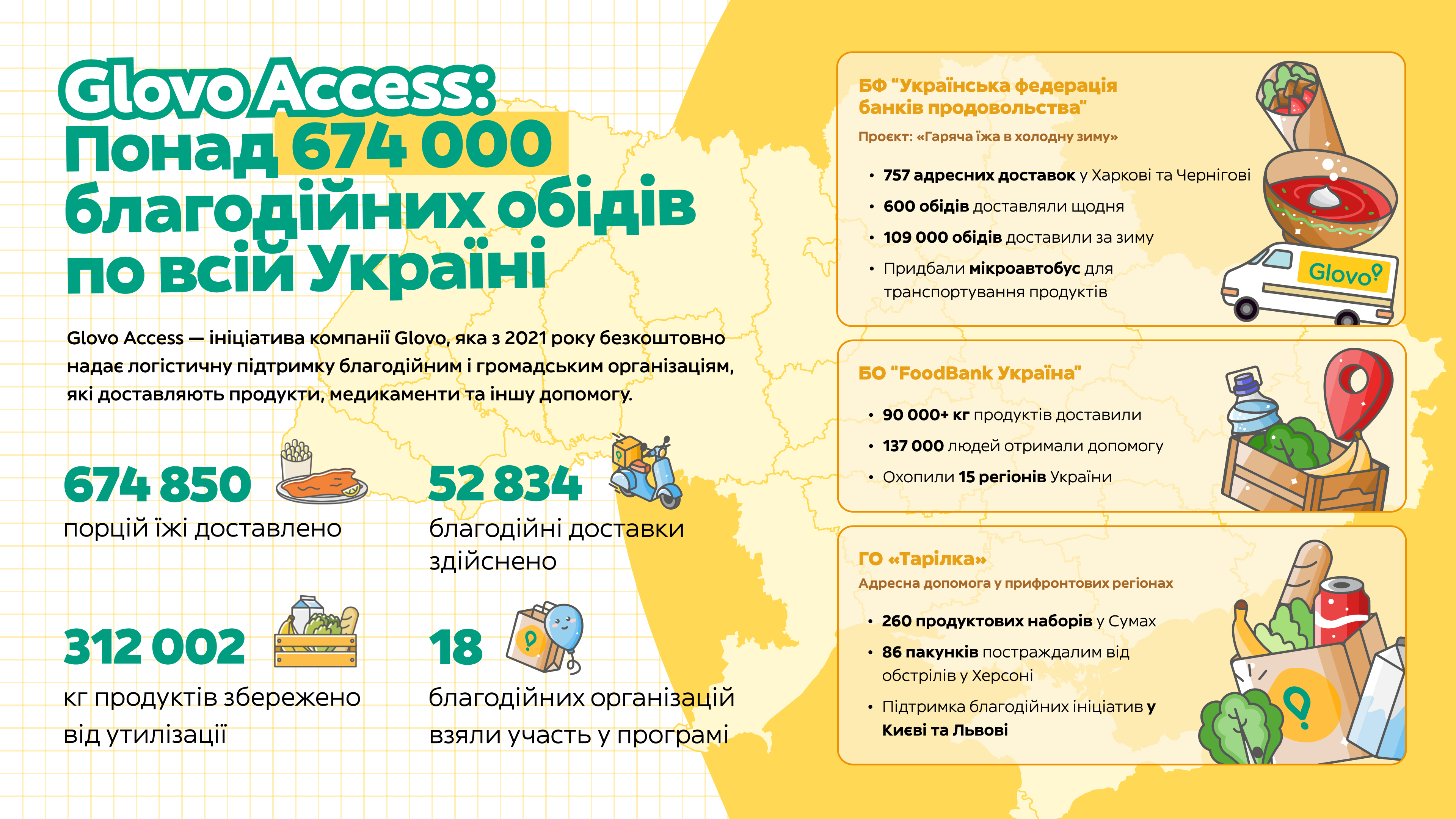 Компанія Glovo підбила підсумки ініціативи Glovo Access: з моменту запуску програми було доставлено понад 674 тисяч благодійних обідів людям, які потребують підтримки. А від початку повномасштабного вторгнення було здійснено майже 42 тисячі доставок і передано 665 тисяч порцій їжі, зокрема в регіонах, які щодня стикаються з викликами війни — на Харківщині, Чернігівщині, Сумщині та Херсонщині. До ініціативи Glovo Access вже долучились 18 благодійних організацій.