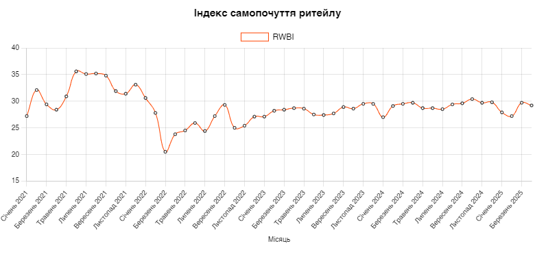 Після стрімкого зростання Індексу самопочуття ритейлу (RWBI) в березні 2025 року, показник квітня стабілізувався на позначці 29,2 пунктів, що на 0,5 пункти менше ніж торік та минулого місяця, пише УРТЦ.