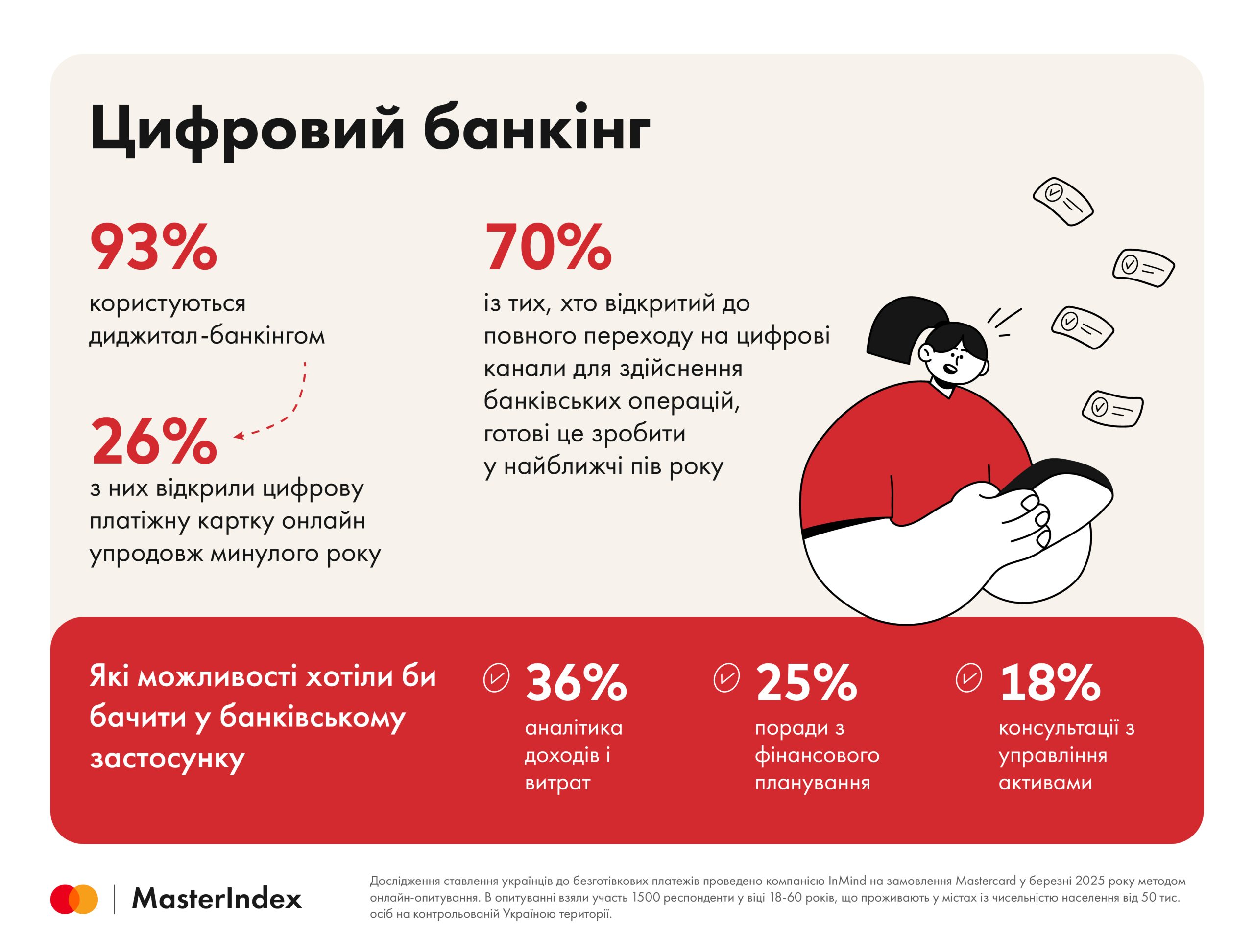 Дев’ять із десяти опитаних користуються цифровим банкінгом — мобільними додатками банків або інтернет-банкінгом. Серед усіх послуг диджитал-банкінгу зокрема зростає популярність функції швидкого відкриття платіжної картки онлайн — таку картку минулого року відкрили понад чверть (26%) респондентів, користувачів цифрового банкінгу.