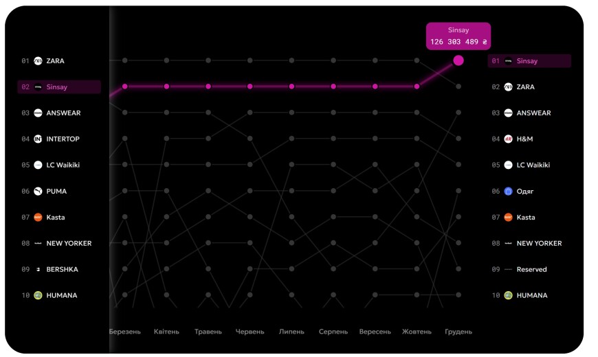 Згідно з даними дашборду від Monobank, Sinsay посідає перше місце, з помітним стрибком обороту в порівнянні з попередніми місяцями.