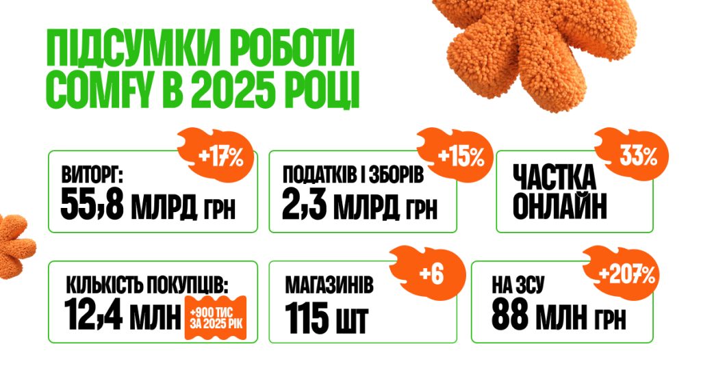 За підсумками 2025 року виторг COMFY склав 55,8 млрд грн, що на 17% більше, ніж у 2024 році. Впродовж року компанія сплатила до державного бюджету 2,3 млрд грн податків і зборів, — повідомили у компанії.