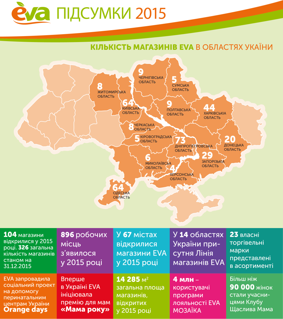 В 2015 году Линия Магазинов EVA открыла 104 новые торговые точки в 67 городах Украины. По состоянию на конец 2015 года сеть EVA насчитывала 326 магазинов с суммарной торговой площадью 52 609 м2. Лидерами по количеству открытий магазинов EVA стали Центральный регион (21 новая торговая точка) и  Харьковская область (27 новых торговых точек). Товарооборот сети […]