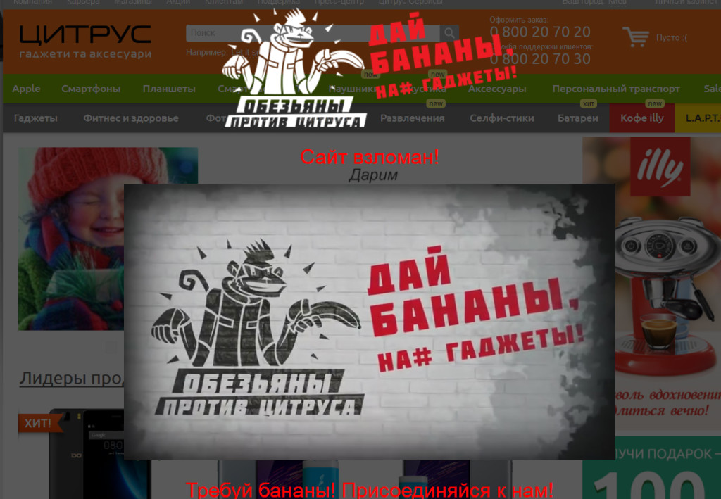 Недавно на Facebook и YouTube появилась группа «Обезьяны против Цитруса». Кто за ней стоит, пока неизвестно, но занимаются они тем, что закрашивают наружку известной сети магазинов. А сегодня взломали и сайт. Около 11:00 утра на Citrus.ua появился наложенный на главную слой с сообщением о взломе и линком на зацикленное видео «обезьян». Видео — это просто зацикленное сообщение «Обезьяны против Цитруса — нафиг гаджеты, […]