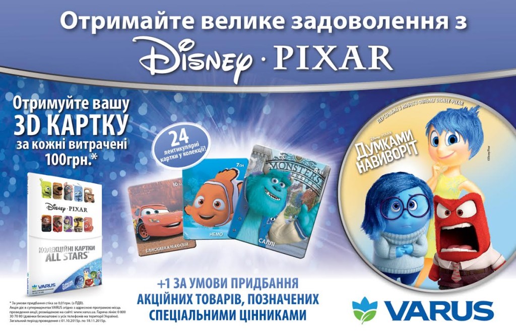 С 1 октября по 18 ноября 2015 года во всех супермаркетах сети VARUS действует акция «All Stars (Всі Зірки)». В этот период все покупатели могут собрать коллекцию из 24-х 3D карточек с изображениями героев из самых популярных мультфильмов Disney Pixar. Коллекционную карточку можно приобрести: за 0,01 гривну, совершив покупку любого товара на 100 гривен; за […]